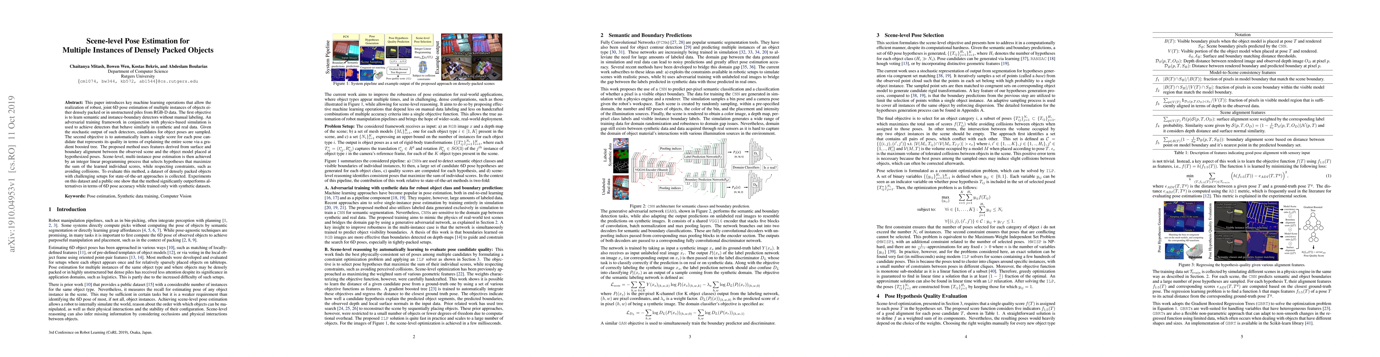 This paper introduces key machine learning operations that allow the realization of robust, joint 6D pose estimation of multiple instances of objects either densely packed or in unstructured piles from RGB-D data. The first objective is to learn semantic and instance-boundary detectors without manual labeling. An adversarial training framework in conjunction with physics-based simulation is used to achieve detectors that behave similarly in synthetic and real data. Given the stochastic output of such detectors, candidates for object poses are sampled. The second objective is to automatically learn a single score for each pose candidate that represents its quality in terms of explaining the entire scene via a gradient boosted tree. The proposed method uses features derived from surface and boundary alignment between the observed scene and the object model placed at hypothesized poses. Scene-level, multi-instance pose estimation is then achieved by an integer linear programming process that selects hypotheses that maximize the sum of the learned individual scores, while respecting constraints, such as avoiding collisions. To evaluate this method, a dataset of densely packed objects with challenging setups for state-of-the-art approaches is collected. Experiments on this dataset and a public one show that the method significantly outperforms alternatives in terms of 6D pose accuracy while trained only with synthetic datasets.