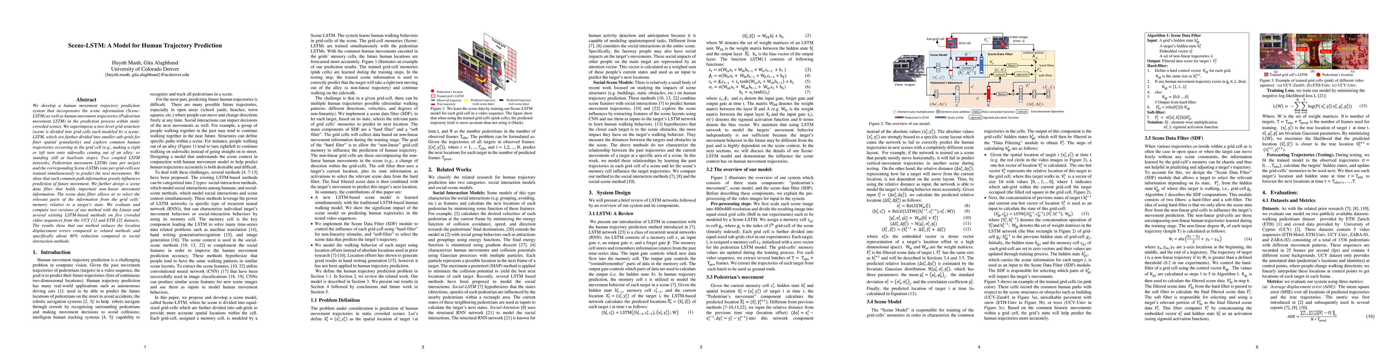 This paper proposes a Scene-LSTM model to predict human movement trajectories in crowded scenes by integrating both scene information and pedestrian movement data. The model uses a two-level grid structure and coupled LSTM networks to capture common human paths, showing significant improvements in prediction accuracy and reducing location displacement errors by about 80% compared to existing methods.