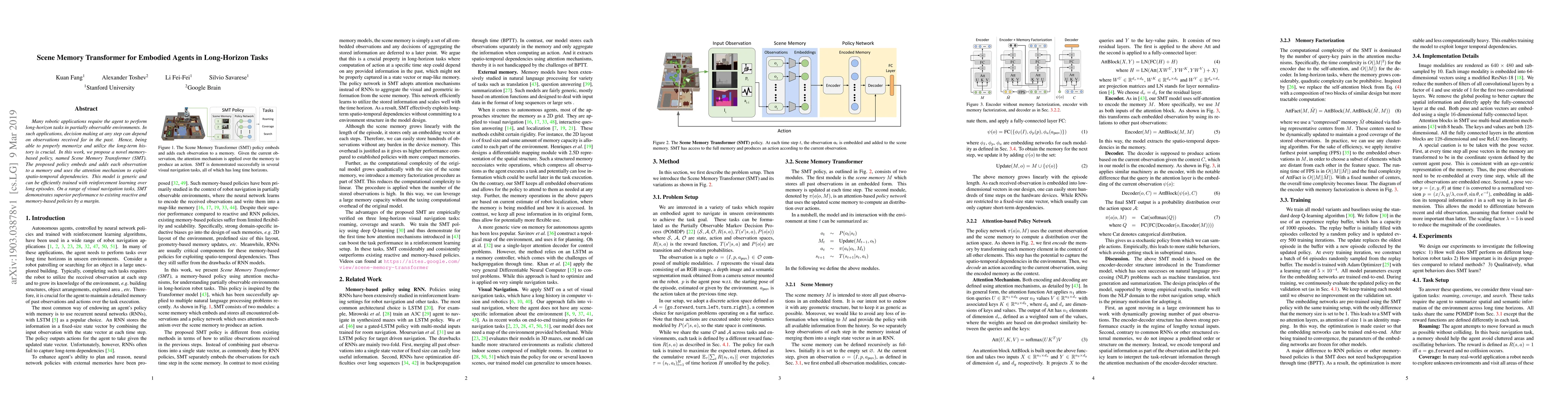 The paper proposes a Scene Memory Transformer (SMT) policy for robotic agents to excel in long-horizon tasks in partially observable environments. SMT embeds and utilizes observations from the past through a memory mechanism and attention to exploit spatio-temporal dependencies, outperforming existing policies in visual navigation tasks.