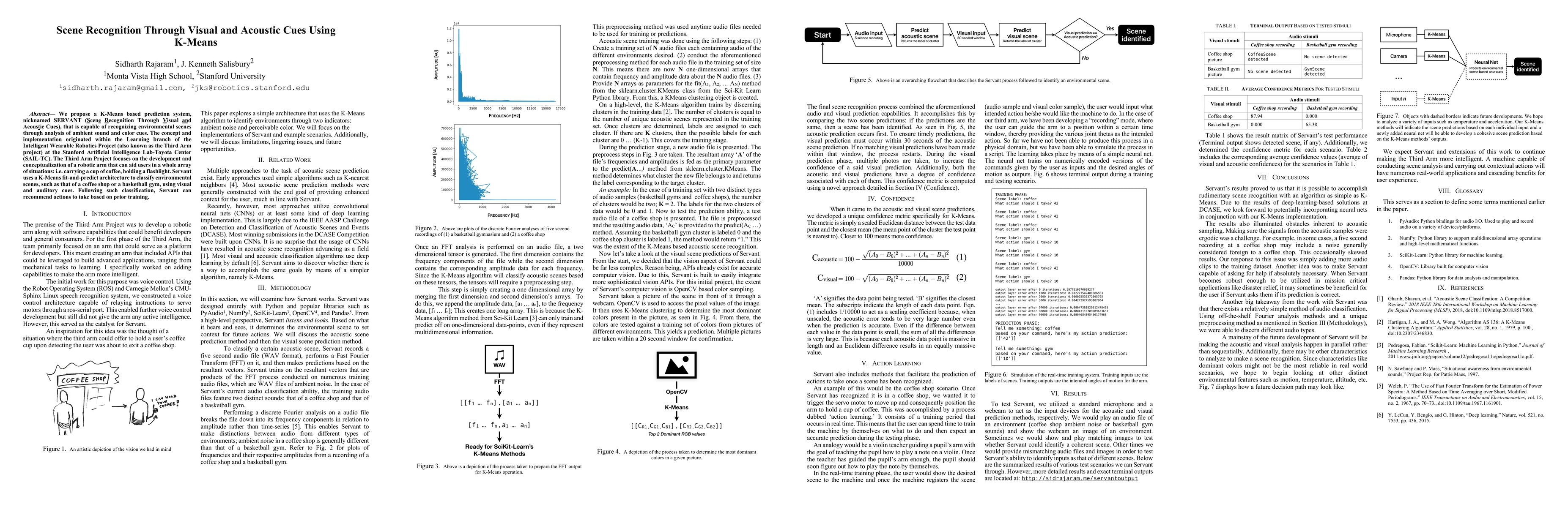 We propose a K-Means based prediction system, nicknamed SERVANT (Scene Recognition Through Visual and Acoustic Cues), that is capable of recognizing environmental scenes through analysis of ambient sound and color cues. The concept and implementation originated within the Learning branch of the Intelligent Wearable Robotics Project (also known as the Third Arm project) at the Stanford Artificial Intelligence Lab-Toyota Center (SAIL-TC). The Third Arm Project focuses on the development and conceptualization of a robotic arm that can aid users in a whole array of situations: i.e. carrying a cup of coffee, holding a flashlight. Servant uses a K-Means fit-and-predict architecture to classify environmental scenes, such as that of a coffee shop or a basketball gym, using visual and auditory cues. Following such classification, Servant can recommend contextual actions based on prior training.