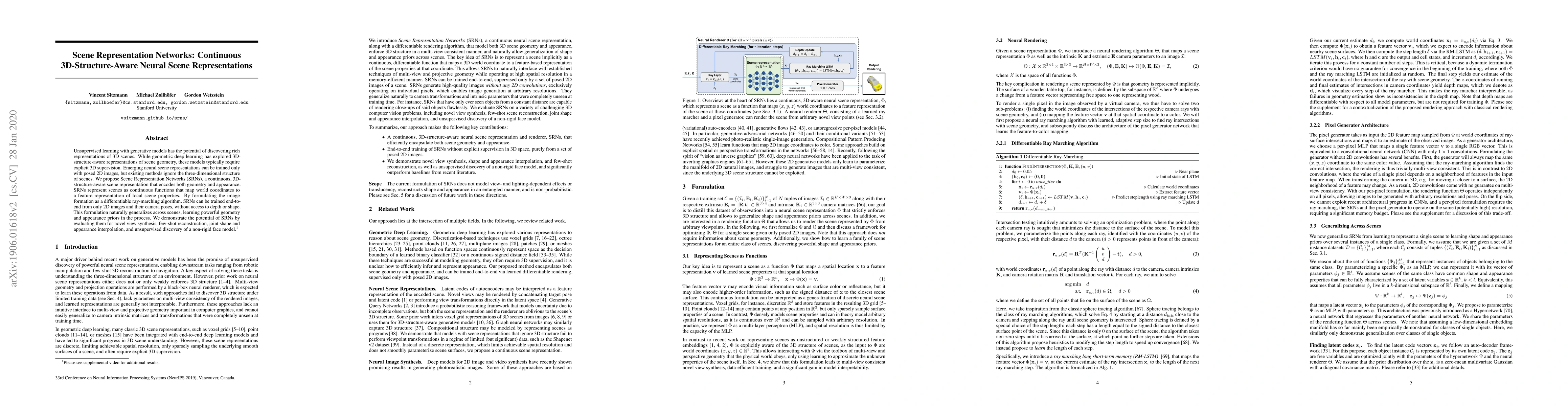 Scene Representation Networks (SRNs) propose a continuous, 3D-structure-aware method to represent scenes using only 2D images and camera poses, enabling unsupervised learning without explicit 3D supervision. SRNs map world coordinates to feature representations, facilitating tasks like novel view synthesis and few-shot reconstruction.