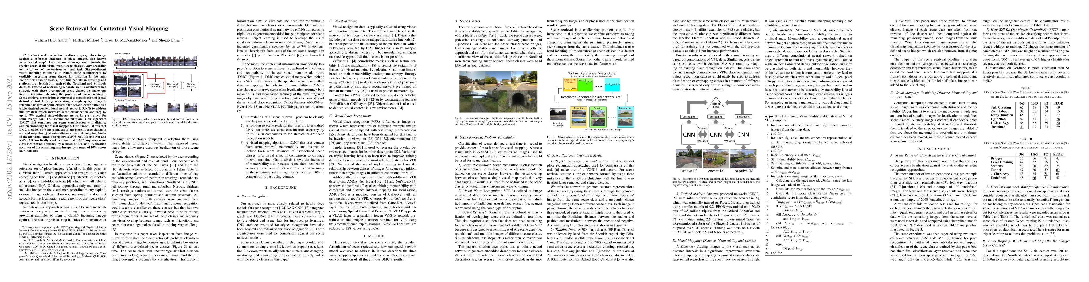 This research introduces a novel approach for scene retrieval in visual navigation, aiming to enhance localization accuracy for specific scene classes within visual maps. The authors propose a triplet-trained convolutional neural network to improve scene classification and introduce an algorithm, DMC, to integrate scene classification with distance and memorability for visual mapping, resulting in better scene class localization and overall map accuracy.