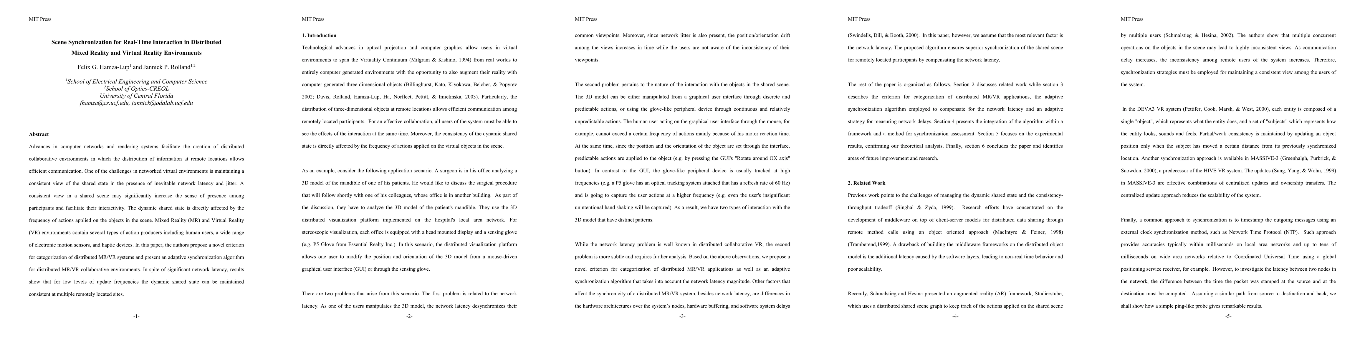 This paper proposes a novel criterion for categorizing distributed Mixed Reality and Virtual Reality systems and introduces an adaptive synchronization algorithm to maintain a consistent shared state despite network latency and jitter, enhancing interactivity and presence among participants. Results indicate that the algorithm effectively maintains consistency at low update frequencies.