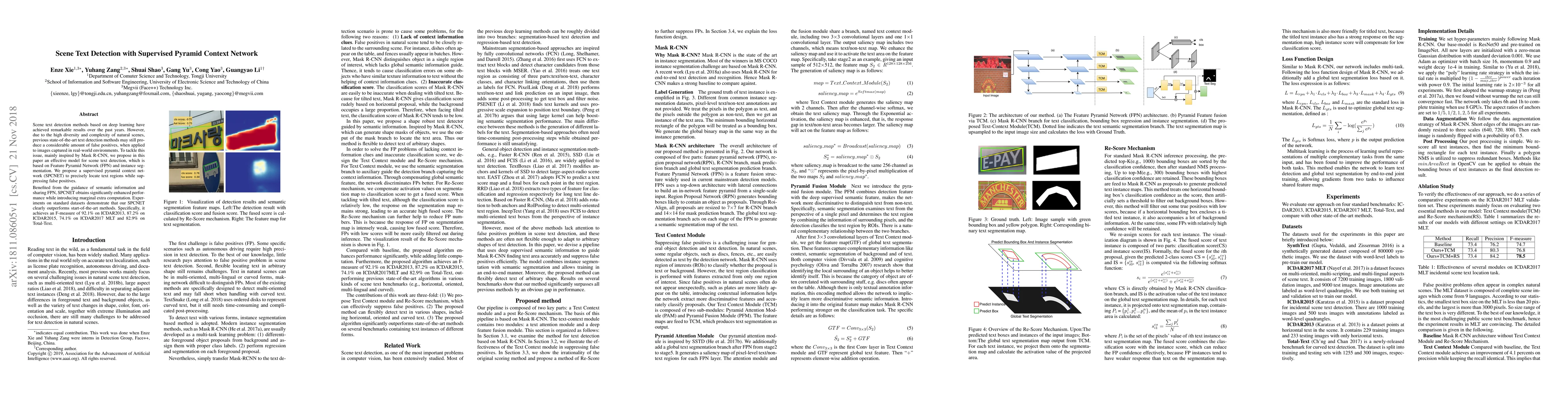 This paper proposes SPCNET, a supervised pyramid context network combining Feature Pyramid Network and instance segmentation to enhance scene text detection accuracy and reduce false positives. Experiments show SPCNET outperforms existing methods, achieving high F-measures on multiple datasets.