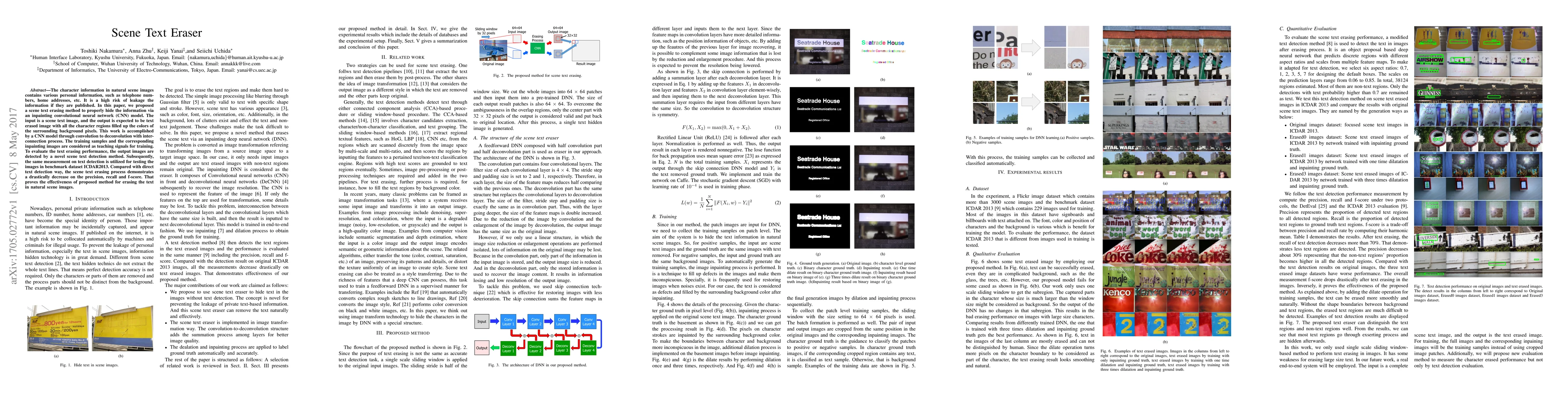 This paper proposes a scene text erasing method using an inpainting convolutional neural network (CNN) to hide sensitive information in natural scene images. The CNN model effectively replaces text regions with surrounding background colors, as demonstrated by a novel scene text detection method and benchmark dataset ICDAR2013, showing significant reductions in text detection precision, recall, and f-score.