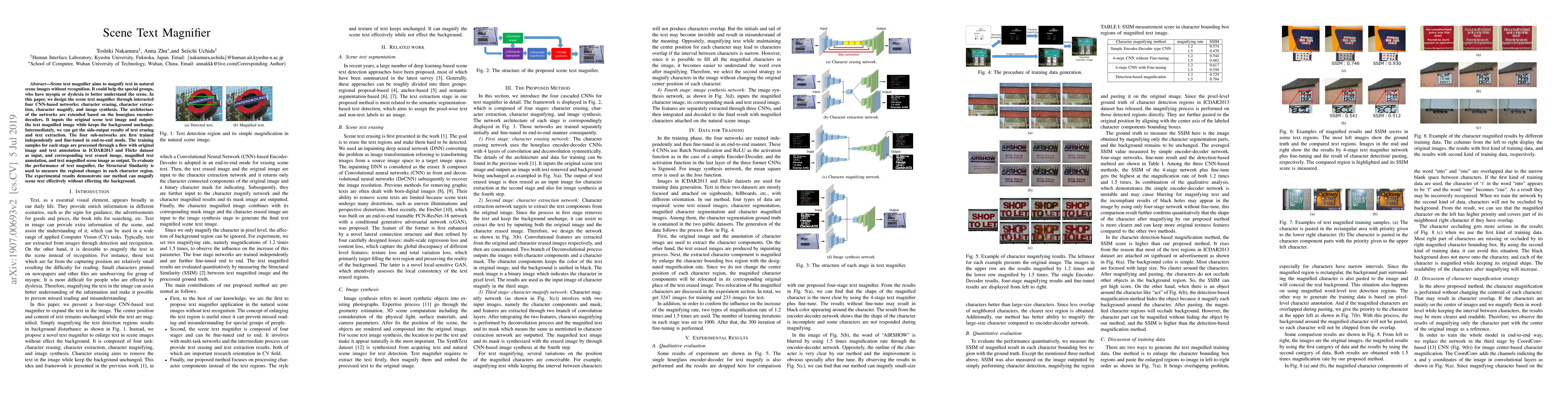 This paper proposes a scene text magnifier using four CNN-based networks to magnify text in natural scene images without altering the background, aiding individuals with myopia or dyslexia. The method employs an extended hourglass encoder-decoder architecture and achieves effective text magnification through independent and fine-tuned training stages.