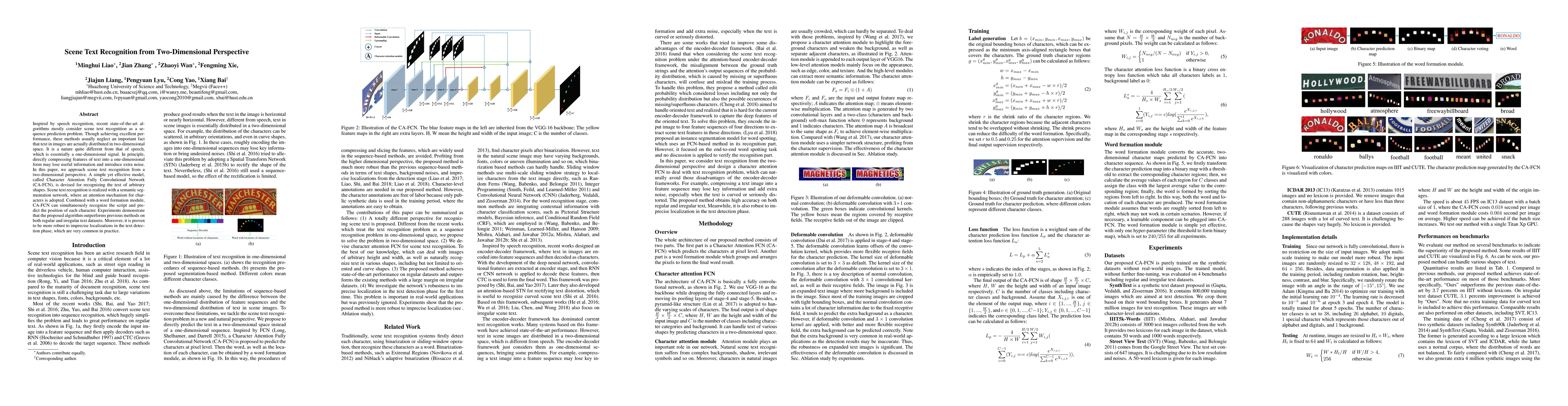 This paper proposes a two-dimensional approach for scene text recognition using a Character Attention Fully Convolutional Network (CA-FCN) that leverages semantic segmentation and character attention mechanisms. The method outperforms existing sequence prediction-based techniques, demonstrating better robustness and accuracy on both regular and irregular text datasets.