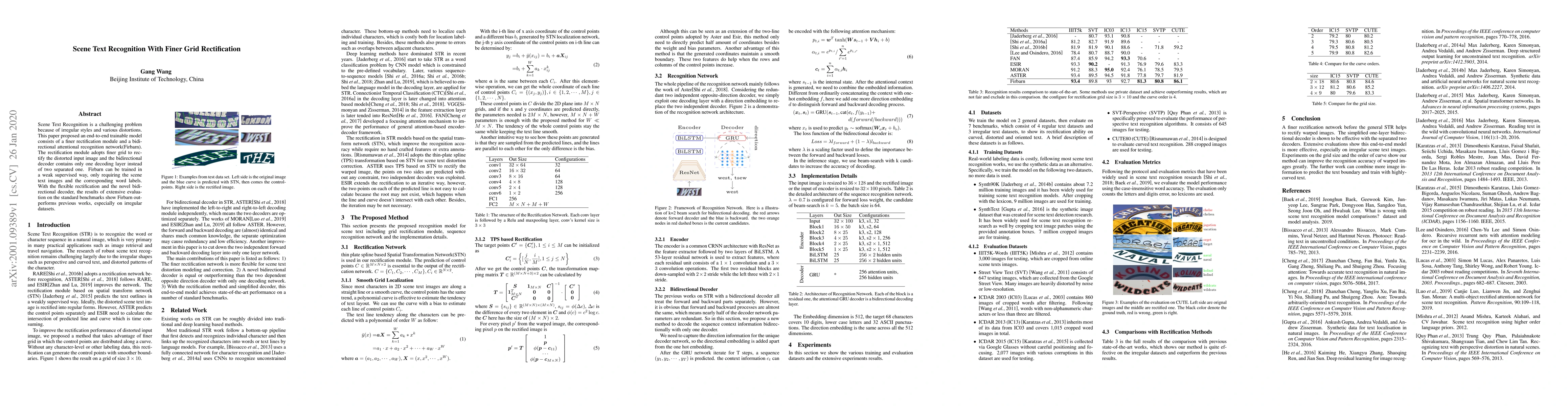 This paper proposes Firbarn, an end-to-end trainable model for scene text recognition that includes a finer grid rectification module and a novel bidirectional attentional recognition network. The model outperforms previous methods, especially on irregular datasets, due to its flexible rectification and simplified decoder.