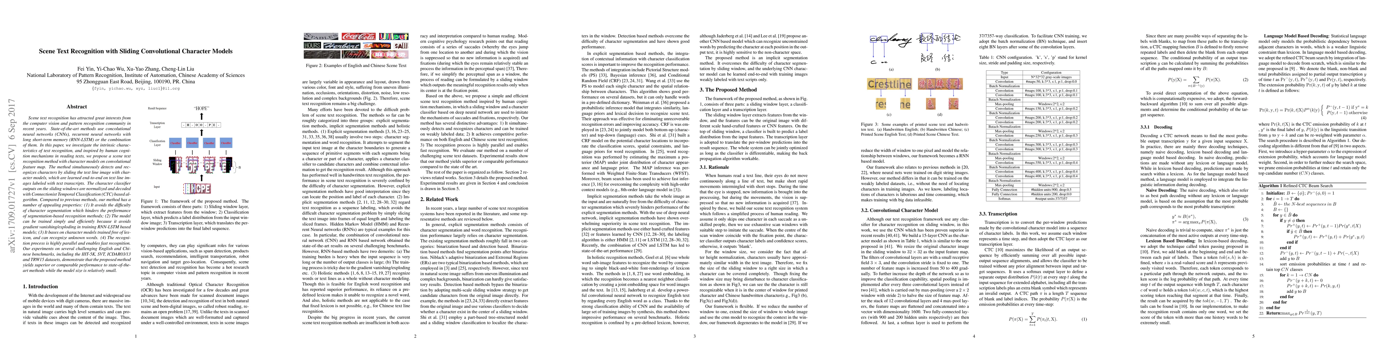 This paper proposes a novel scene text recognition method using sliding convolutional character models that detect and recognize characters directly from text line images without requiring segmentation. The method, trained end-to-end with CTC, avoids character segmentation issues, gradient problems in RNN-LSTM training, and lexicon dependency, delivering superior or comparable performance on various benchmarks.