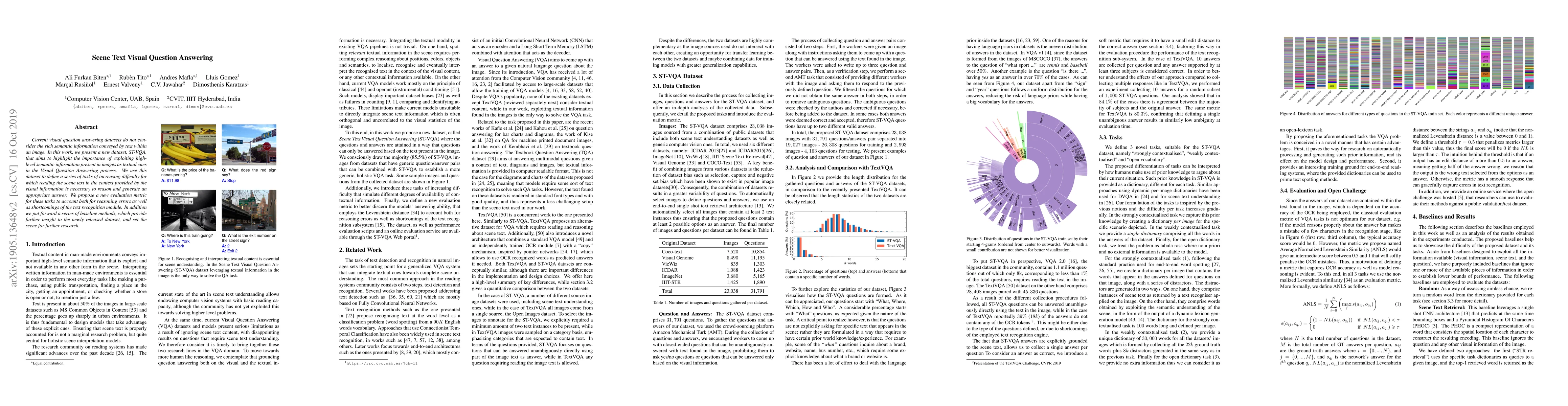 This paper introduces the ST-VQA dataset to enhance visual question answering (VQA) by incorporating scene text as high-level semantic cues. It proposes a new evaluation metric and baseline methods to assess the integration of textual and visual information, setting the stage for further research in this area.