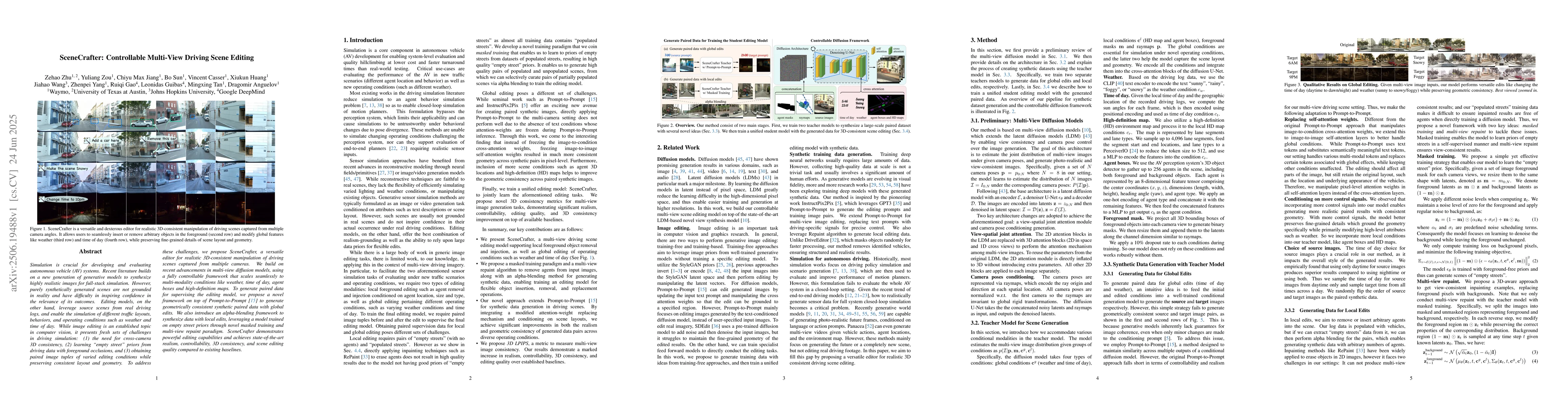 The paper introduces SceneCrafter, a versatile editor for realistic 3D-consistent manipulation of driving scenes from multiple cameras. It uses advancements in multi-view diffusion models, offering controllable frameworks for various conditions like weather and time of day. SceneCrafter generates paired data for supervising the editing model via novel synthetic data generation methods, achieving state-of-the-art realism, controllability, 3D consistency, and editing quality.