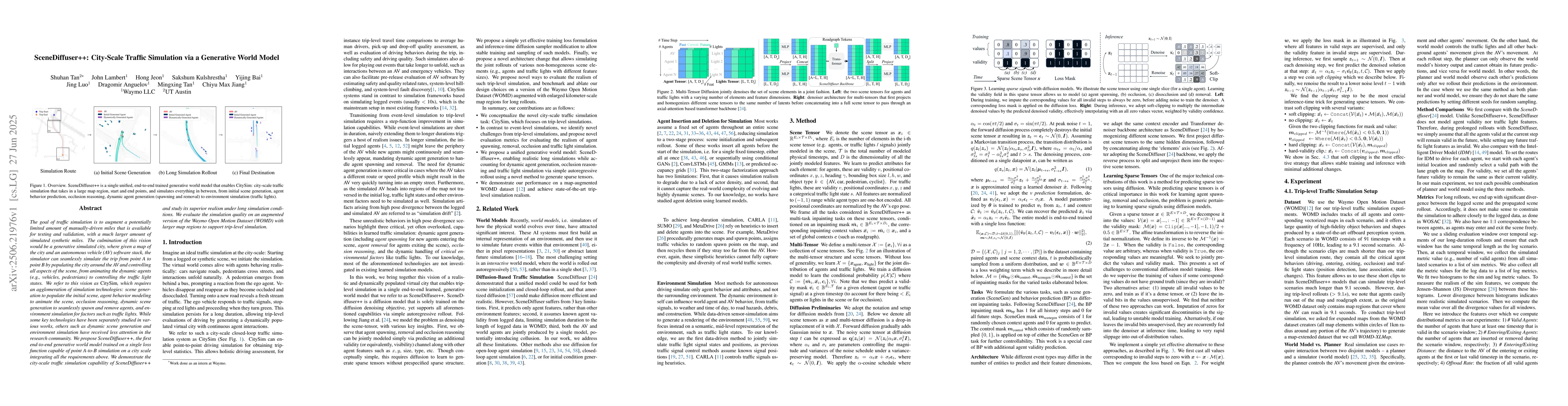 The goal of traffic simulation is to augment a potentially limited amount of manually-driven miles that is available for testing and validation, with a much larger amount of simulated synthetic miles. The culmination of this vision would be a generative simulated city, where given a map of the city and an autonomous vehicle (AV) software stack, the simulator can seamlessly simulate the trip from point A to point B by populating the city around the AV and controlling all aspects of the scene, from animating the dynamic agents (e.g., vehicles, pedestrians) to controlling the traffic light states. We refer to this vision as CitySim, which requires an agglomeration of simulation technologies: scene generation to populate the initial scene, agent behavior modeling to animate the scene, occlusion reasoning, dynamic scene generation to seamlessly spawn and remove agents, and environment simulation for factors such as traffic lights. While some key technologies have been separately studied in various works, others such as dynamic scene generation and environment simulation have received less attention in the research community. We propose SceneDiffuser++, the first end-to-end generative world model trained on a single loss function capable of point A-to-B simulation on a city scale integrating all the requirements above. We demonstrate the city-scale traffic simulation capability of SceneDiffuser++ and study its superior realism under long simulation conditions. We evaluate the simulation quality on an augmented version of the Waymo Open Motion Dataset (WOMD) with larger map regions to support trip-level simulation.
