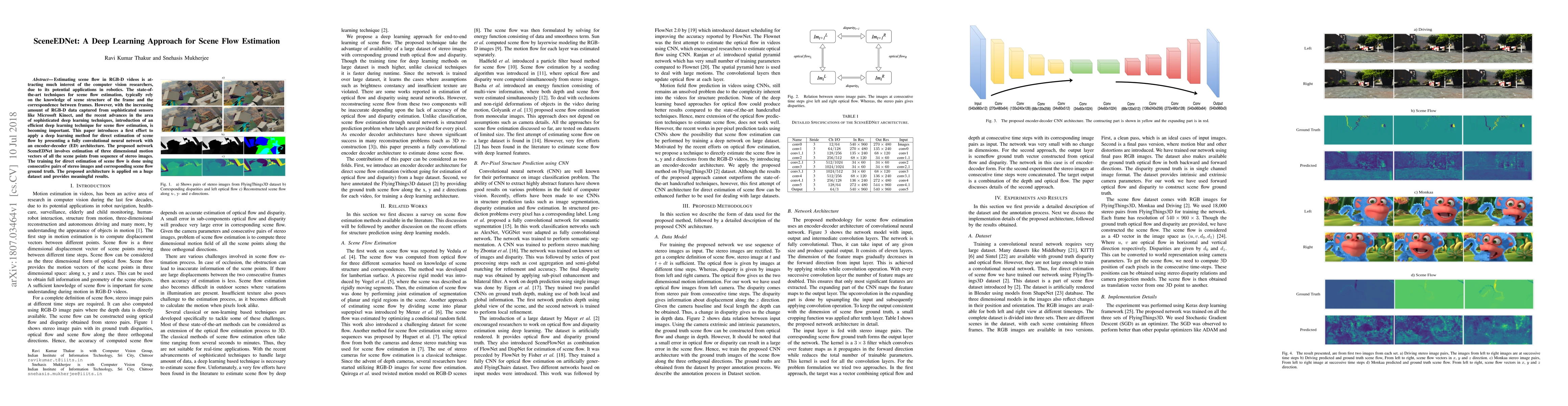 This paper introduces SceneEDNet, a deep learning approach using a fully convolutional encoder-decoder architecture for direct estimation of scene flow in RGB-D videos. The method trains on stereo image pairs and corresponding ground truth to achieve accurate three-dimensional motion vector estimation.