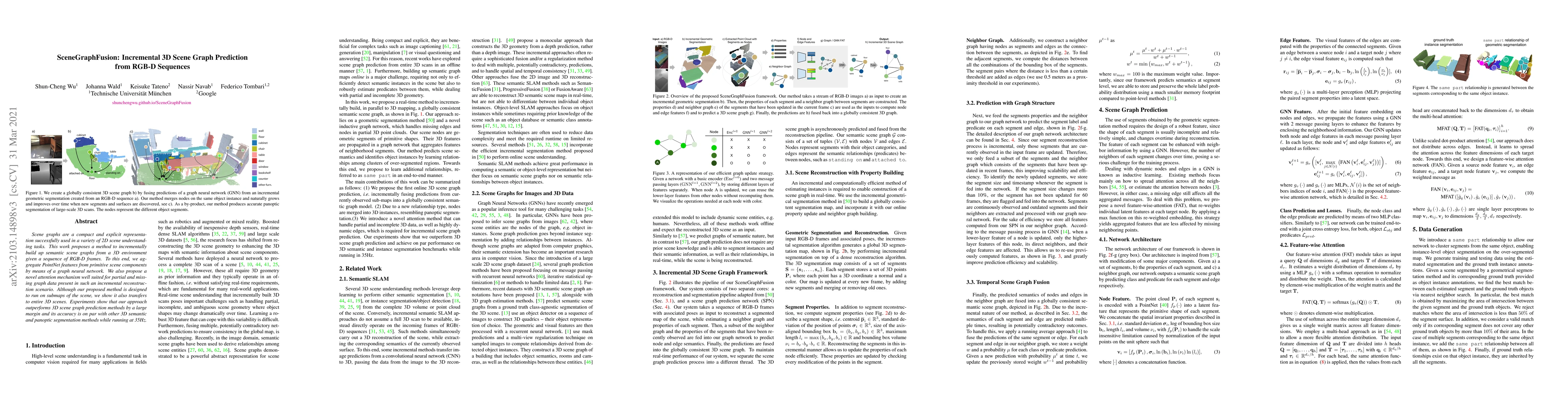 SceneGraphFusion introduces an incremental method for constructing 3D scene graphs from RGB-D sequences using PointNet features and a graph neural network, enhanced by an attention mechanism for partial data. The method is efficient, achieving high accuracy comparable to other 3D segmentation techniques while operating at 35 Hz.