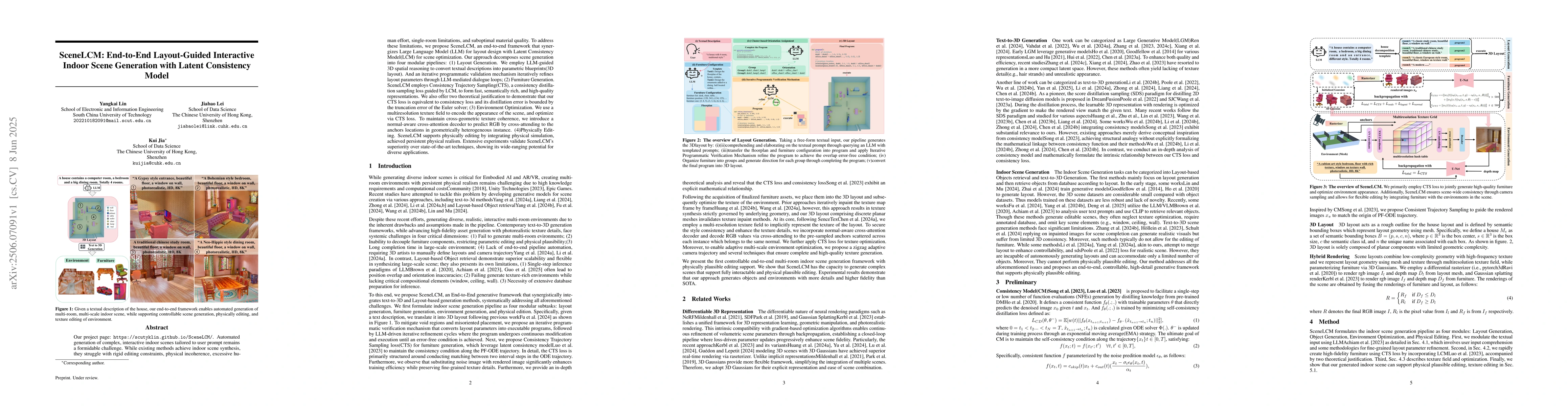 Our project page: https://scutyklin.github.io/SceneLCM/. Automated generation of complex, interactive indoor scenes tailored to user prompt remains a formidable challenge. While existing methods achieve indoor scene synthesis, they struggle with rigid editing constraints, physical incoherence, excessive human effort, single-room limitations, and suboptimal material quality. To address these limitations, we propose SceneLCM, an end-to-end framework that synergizes Large Language Model (LLM) for layout design with Latent Consistency Model(LCM) for scene optimization. Our approach decomposes scene generation into four modular pipelines: (1) Layout Generation. We employ LLM-guided 3D spatial reasoning to convert textual descriptions into parametric blueprints(3D layout). And an iterative programmatic validation mechanism iteratively refines layout parameters through LLM-mediated dialogue loops; (2) Furniture Generation. SceneLCM employs Consistency Trajectory Sampling(CTS), a consistency distillation sampling loss guided by LCM, to form fast, semantically rich, and high-quality representations. We also offer two theoretical justification to demonstrate that our CTS loss is equivalent to consistency loss and its distillation error is bounded by the truncation error of the Euler solver; (3) Environment Optimization. We use a multiresolution texture field to encode the appearance of the scene, and optimize via CTS loss. To maintain cross-geometric texture coherence, we introduce a normal-aware cross-attention decoder to predict RGB by cross-attending to the anchors locations in geometrically heterogeneous instance. (4)Physically Editing. SceneLCM supports physically editing by integrating physical simulation, achieved persistent physical realism. Extensive experiments validate SceneLCM's superiority over state-of-the-art techniques, showing its wide-ranging potential for diverse applications.