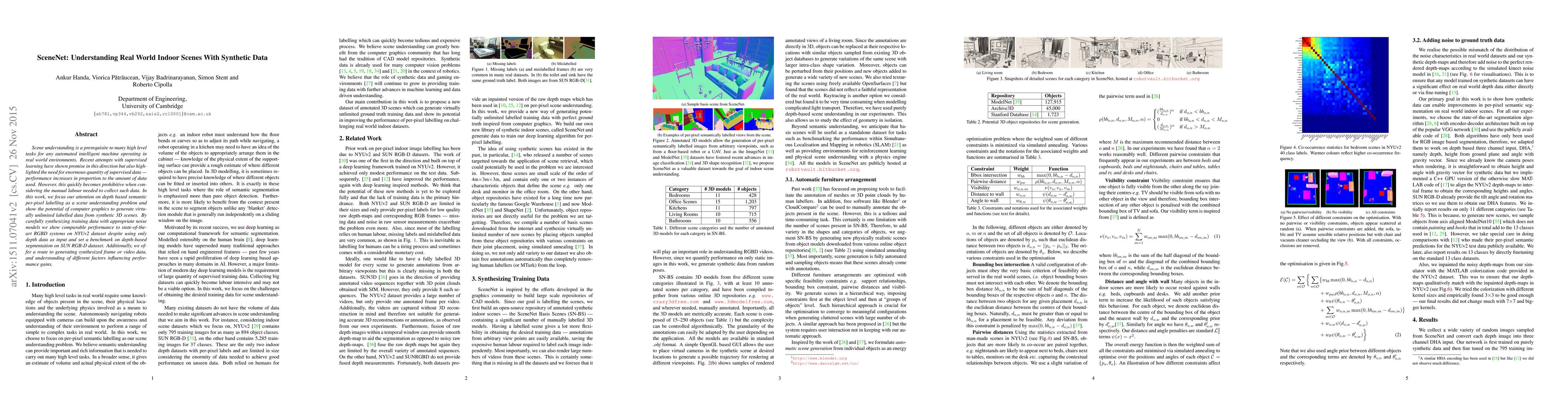 Scene understanding is a prerequisite to many high level tasks for any automated intelligent machine operating in real world environments. Recent attempts with supervised learning have shown promise in this direction but also highlighted the need for enormous quantity of supervised data --- performance increases in proportion to the amount of data used. However, this quickly becomes prohibitive when considering the manual labour needed to collect such data. In this work, we focus our attention on depth based semantic per-pixel labelling as a scene understanding problem and show the potential of computer graphics to generate virtually unlimited labelled data from synthetic 3D scenes. By carefully synthesizing training data with appropriate noise models we show comparable performance to state-of-the-art RGBD systems on NYUv2 dataset despite using only depth data as input and set a benchmark on depth-based segmentation on SUN RGB-D dataset. Additionally, we offer a route to generating synthesized frame or video data, and understanding of different factors influencing performance gains.