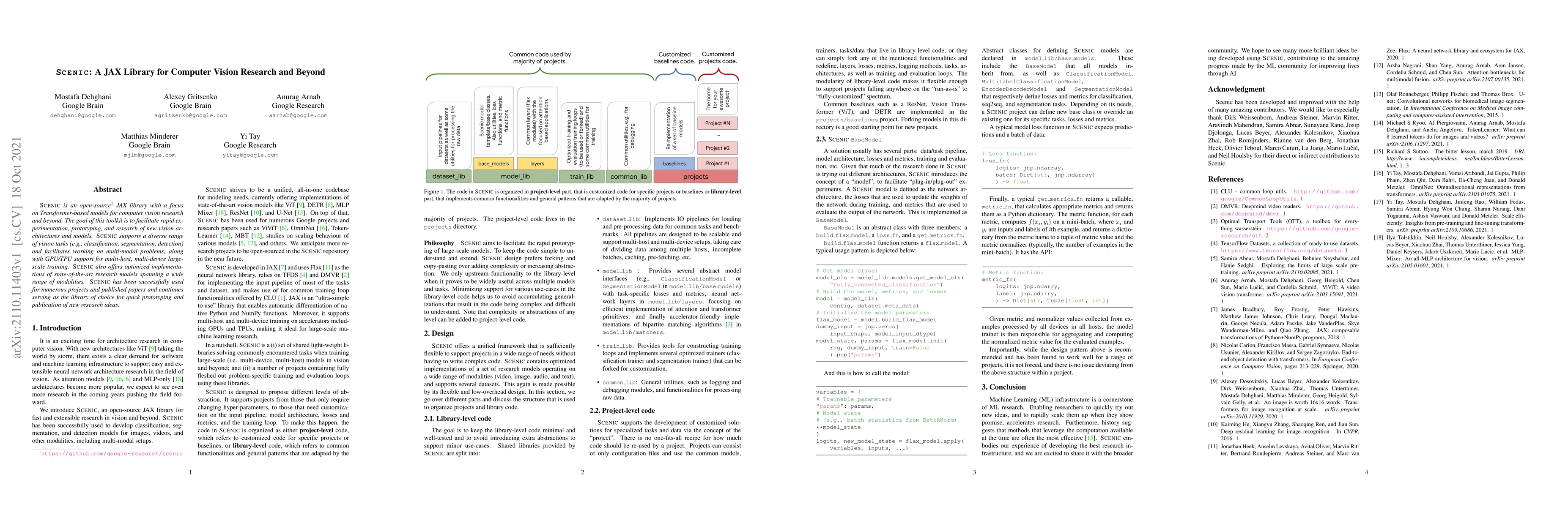 Scenic is an open-source JAX library with a focus on Transformer-based models for computer vision research and beyond. The goal of this toolkit is to facilitate rapid experimentation, prototyping, and research of new vision architectures and models. Scenic supports a diverse range of vision tasks (e.g., classification, segmentation, detection)and facilitates working on multi-modal problems, along with GPU/TPU support for multi-host, multi-device large-scale training. Scenic also offers optimized implementations of state-of-the-art research models spanning a wide range of modalities. Scenic has been successfully used for numerous projects and published papers and continues serving as the library of choice for quick prototyping and publication of new research ideas.