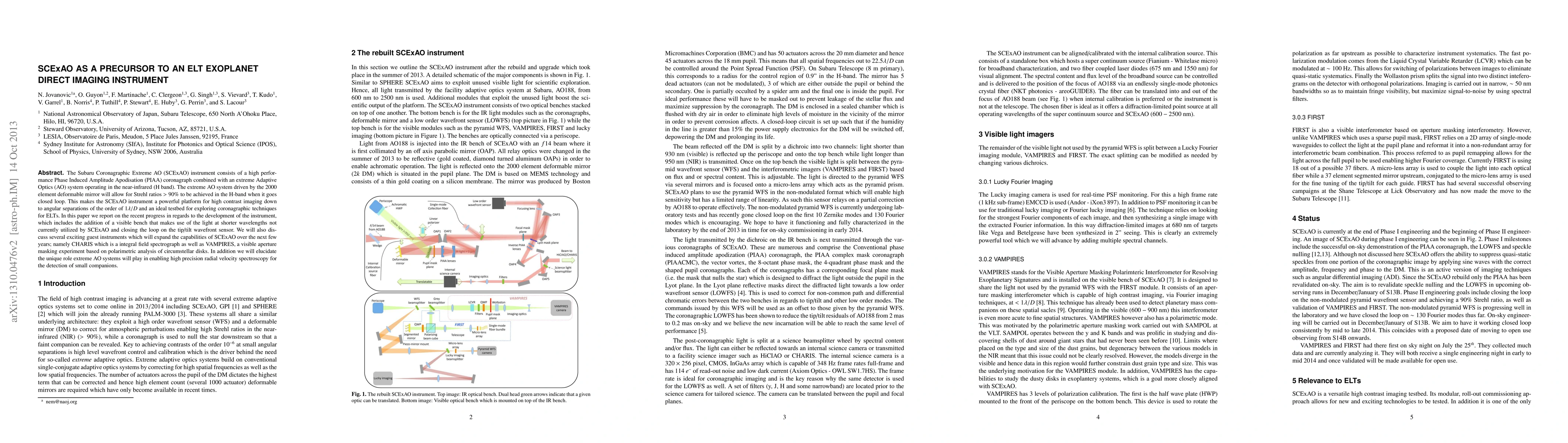 The SCExAO instrument, combining a PIAA coronagraph with an advanced adaptive optics system, serves as a precursor for future exoplanet direct imaging instruments on Extremely Large Telescopes (ELTs). Recent developments include a visible bench and improved wavefront sensor, alongside upcoming guest instruments like CHARIS and VAMPIRES, enhancing SCExAO's capabilities for high contrast imaging and radial velocity spectroscopy.