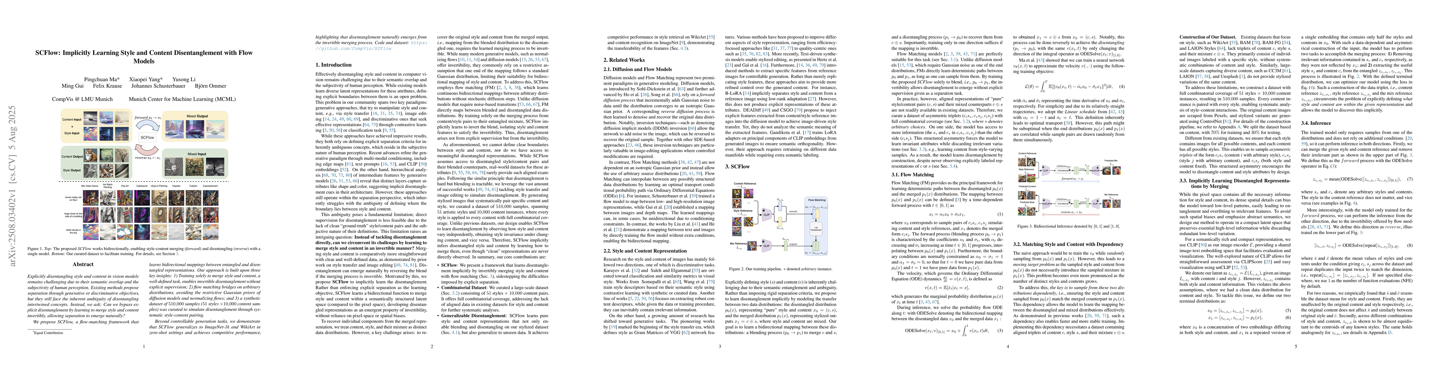 Explicitly disentangling style and content in vision models remains challenging due to their semantic overlap and the subjectivity of human perception. Existing methods propose separation through generative or discriminative objectives, but they still face the inherent ambiguity of disentangling intertwined concepts. Instead, we ask: Can we bypass explicit disentanglement by learning to merge style and content invertibly, allowing separation to emerge naturally? We propose SCFlow, a flow-matching framework that learns bidirectional mappings between entangled and disentangled representations. Our approach is built upon three key insights: 1) Training solely to merge style and content, a well-defined task, enables invertible disentanglement without explicit supervision; 2) flow matching bridges on arbitrary distributions, avoiding the restrictive Gaussian priors of diffusion models and normalizing flows; and 3) a synthetic dataset of 510,000 samples (51 styles $\times$ 10,000 content samples) was curated to simulate disentanglement through systematic style-content pairing. Beyond controllable generation tasks, we demonstrate that SCFlow generalizes to ImageNet-1k and WikiArt in zero-shot settings and achieves competitive performance, highlighting that disentanglement naturally emerges from the invertible merging process.