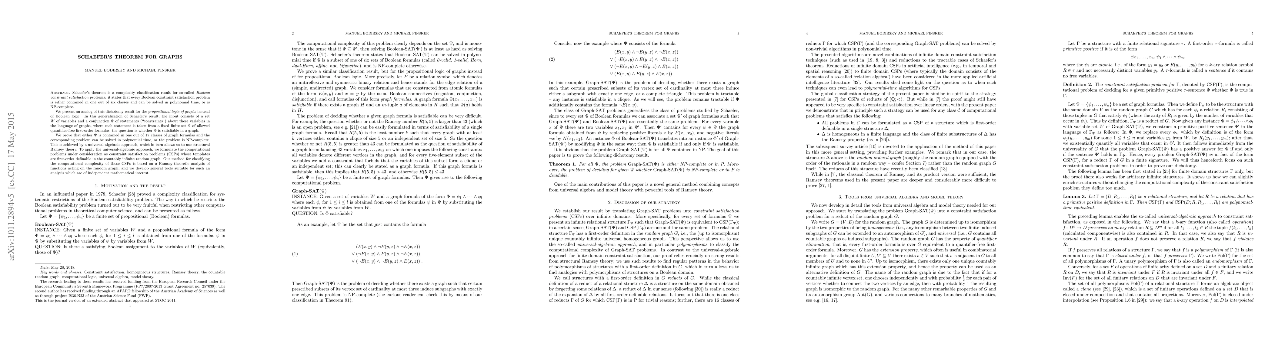 Schaefer's theorem is a complexity classification result for so-called Boolean constraint satisfaction problems: it states that every Boolean constraint satisfaction problem is either contained in one out of six classes and can be solved in polynomial time, or is NP-complete. We present an analog of this dichotomy result for the propositional logic of graphs instead of Boolean logic. In this generalization of Schaefer's result, the input consists of a set W of variables and a conjunction \Phi\ of statements ("constraints") about these variables in the language of graphs, where each statement is taken from a fixed finite set \Psi\ of allowed quantifier-free first-order formulas; the question is whether \Phi\ is satisfiable in a graph. We prove that either \Psi\ is contained in one out of 17 classes of graph formulas and the corresponding problem can be solved in polynomial time, or the problem is NP-complete. This is achieved by a universal-algebraic approach, which in turn allows us to use structural Ramsey theory. To apply the universal-algebraic approach, we formulate the computational problems under consideration as constraint satisfaction problems (CSPs) whose templates are first-order definable in the countably infinite random graph. Our method to classify the computational complexity of those CSPs is based on a Ramsey-theoretic analysis of functions acting on the random graph, and we develop general tools suitable for such an analysis which are of independent mathematical interest.