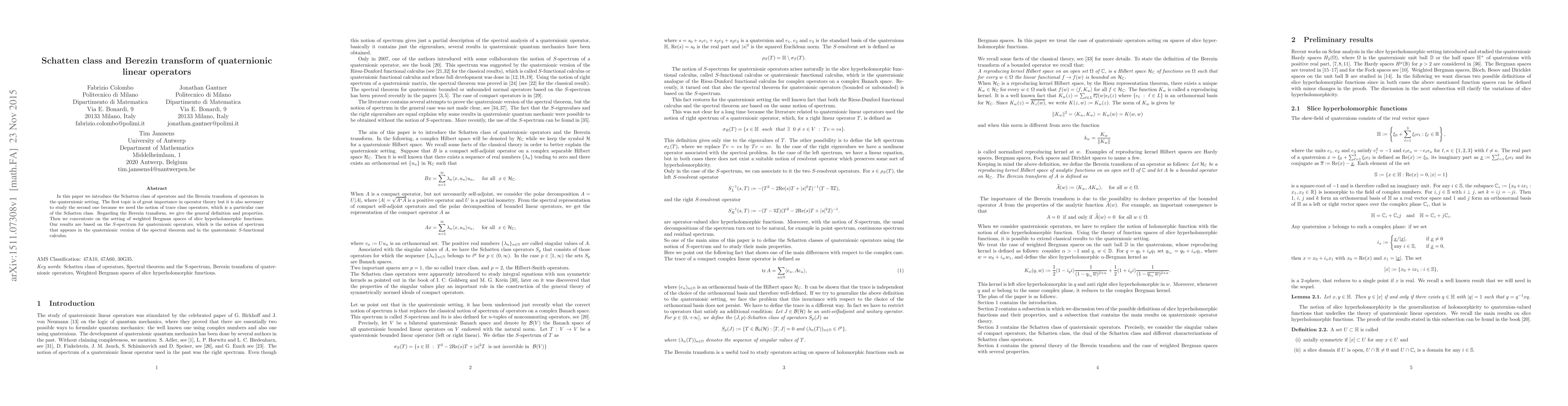 In this paper we introduce the Schatten class of operators and the Berezin transform of operators in the quaternionic setting. The first topic is of great importance in operator theory but it is also necessary to study the second one because we need the notion of trace class operators, which is a particular case of the Schatten class. Regarding the Berezin transform, we give the general definition and properties. Then we concentrate on the setting of weighted Bergman spaces of slice hyperholomorphic functions. Our results are based on the S-spectrum for quaternionic operators, which is the notion of spectrum that appears in the quaternionic version of the spectral theorem and in the quaternionic S-functional calculus.
