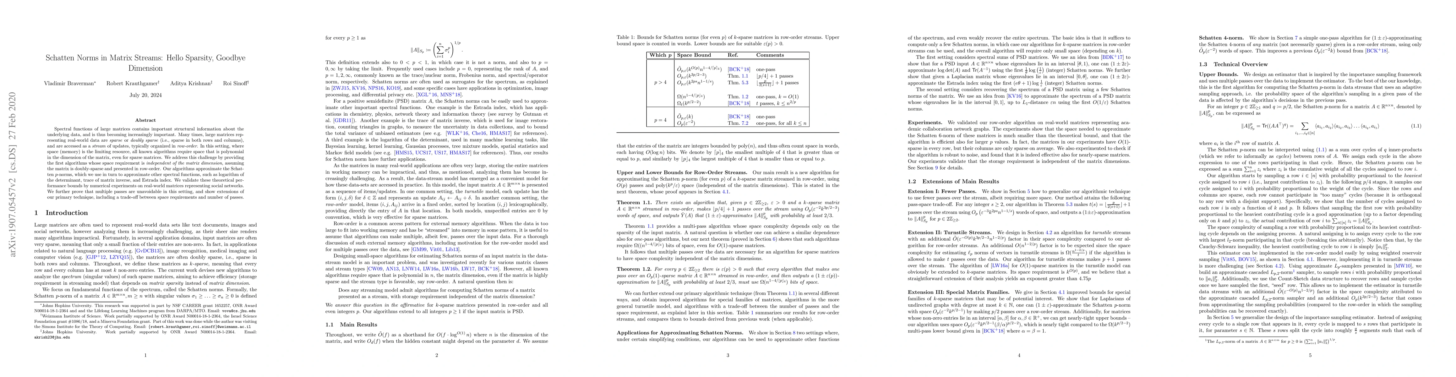 This paper presents novel algorithms for approximating Schatten $p$-norms in large, doubly-sparse matrices streamed in row-order, achieving space requirements independent of matrix dimension. These algorithms also estimate spectral functions like the logarithm of the determinant and trace of matrix inverse, validated by experiments on social network data.