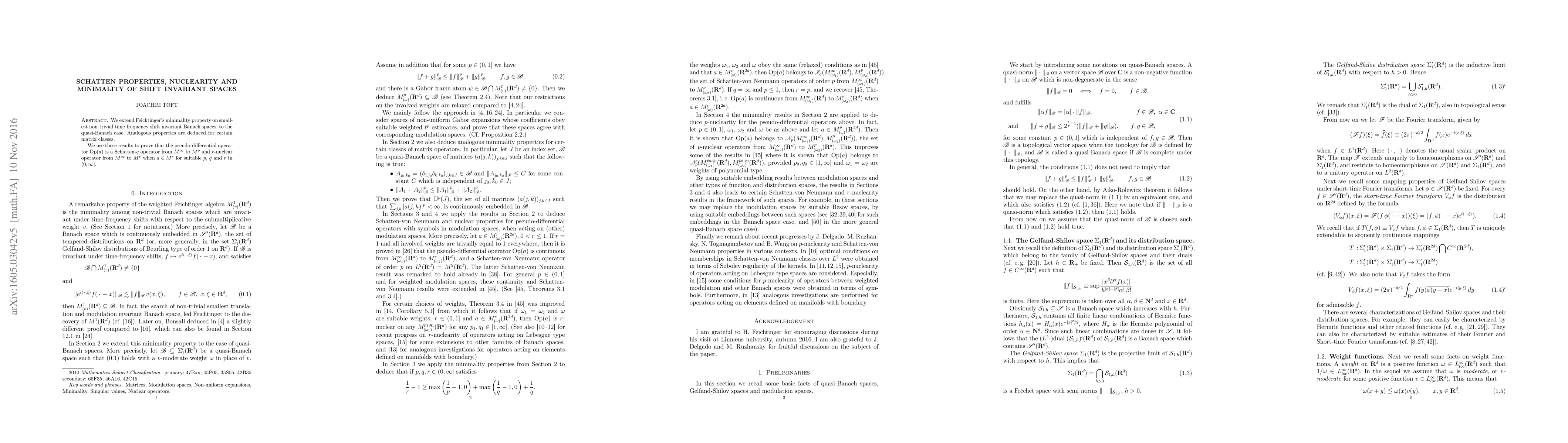 We extend Feichtinger's minimality property on smallest non-trivial time-frequency shift invariant Banach spaces, to the quasi-Banach case. Analogous properties are deduced for certain matrix classes. We use these results to prove that $\operatorname{Op}(a)$ is a Schatten-$q$ operator from $M^\infty$ to $M^p$ and $r$-nuclear operator from $M^\infty$ to $M^r$ when $a\in M^r$ for suitable $p$, $q$ and $r$ in $(0,\infty ]$.