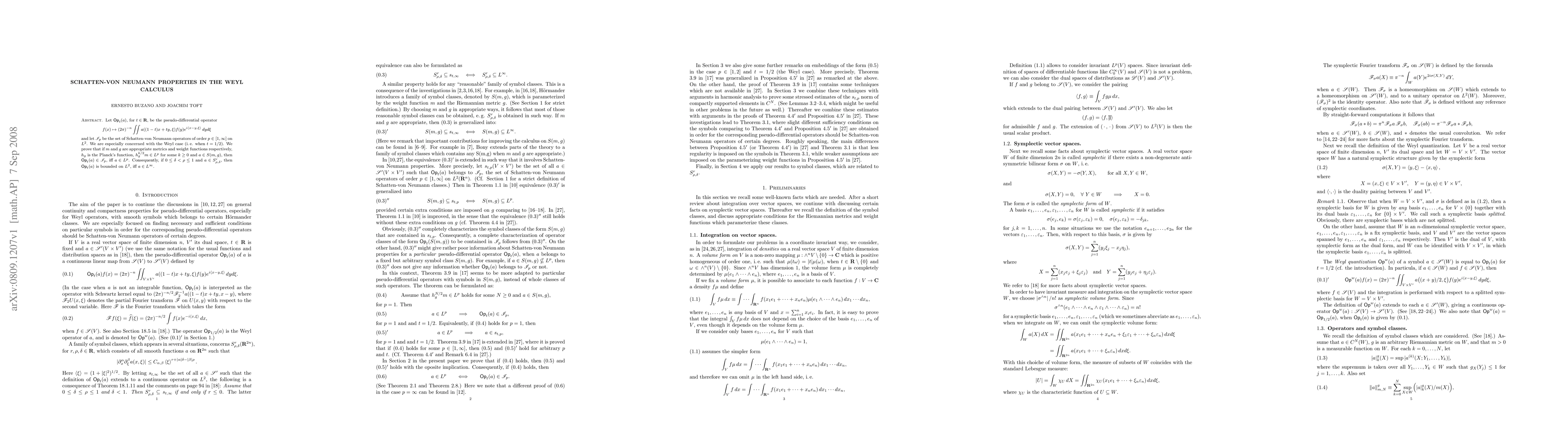 Let $\Op_t(a)$, for $t\in \mathbf R$, be the pseudo-differential operator $$ f(x) \mapsto (2\pi)^{-n}\iint a((1-t)x+ty,\xi)f(y)e^{i\scal {x-y}\xi} dyd\xi $$ and let $\mathscr I_p$ be the set of Schatten-von Neumann operators of order $p\in [1,\infty ]$ on $L^2$. We are especially concerned with the Weyl case (i.{}e. when $t=1/2$). We prove that if $m$ and $g$ are appropriate metrics and weight functions respectively, $h_g$ is the Planck's function, $h_g^{k/2}m\in L^p$ for some $k\ge 0$ and $a\in S(m,g)$, then $\Op_t(a)\in \mathscr I_p$, iff $a\in L^p$. Consequently, if $0\le \delta <\rho \le 1$ and $a\in S^r_{\rho ,\delta}$, then $\Op_t(a)$ is bounded on $L^2$, iff $a\in L^\infty$.