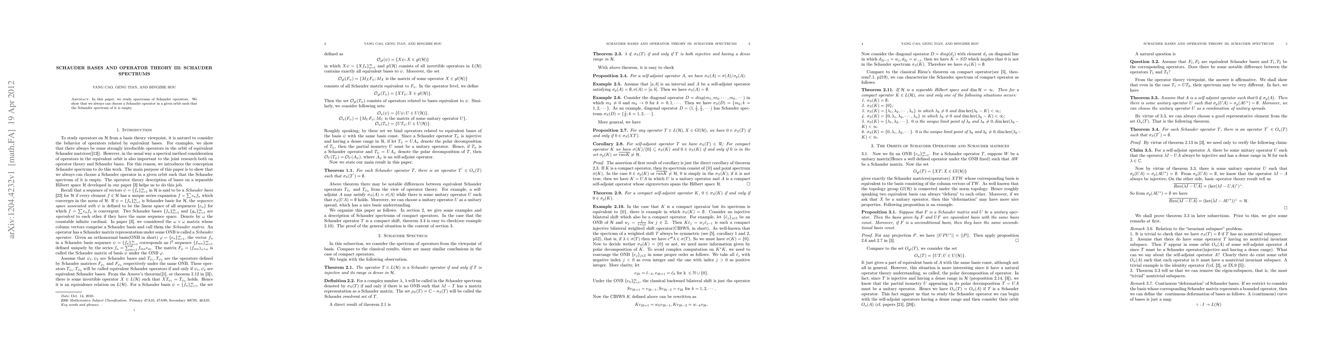 This paper investigates the spectrums of Schauder operators, demonstrating that within any given orbit, one can select a Schauder operator with an empty Schauder spectrum. The findings contribute to operator theory and the understanding of Schauder bases.