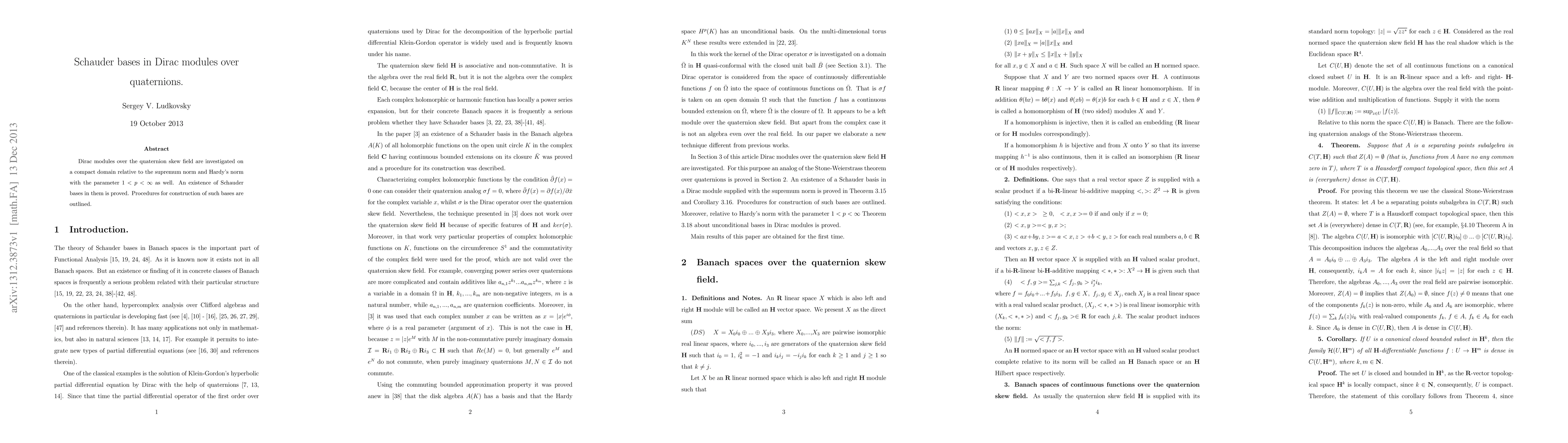 Dirac modules over the quaternion skew field are investigated on a compact domain relative to the supremum norm and Hardy's norm with the parameter $1