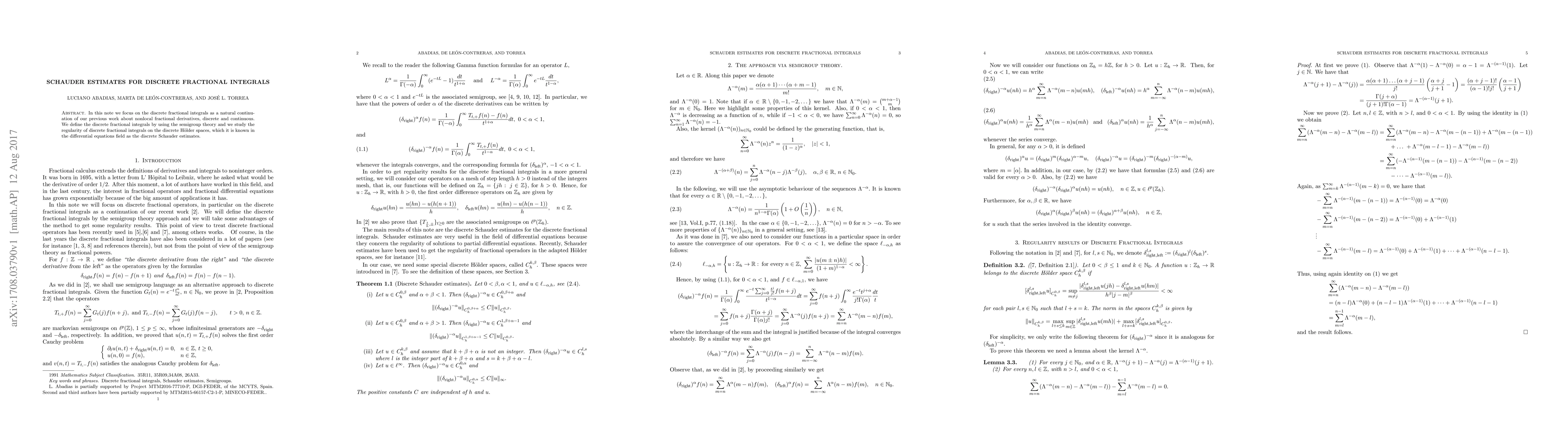 In this note we focus on the discrete fractional integrals as a natural continuation of our previous work about nonlocal fractional derivatives, discrete and continuous. We define the discrete fractional integrals by using the semigroup theory and we study the regularity of {discrete fractional integrals} on the discrete H\"older spaces, which it is known in the differential equations field as the discrete Schauder estimates.