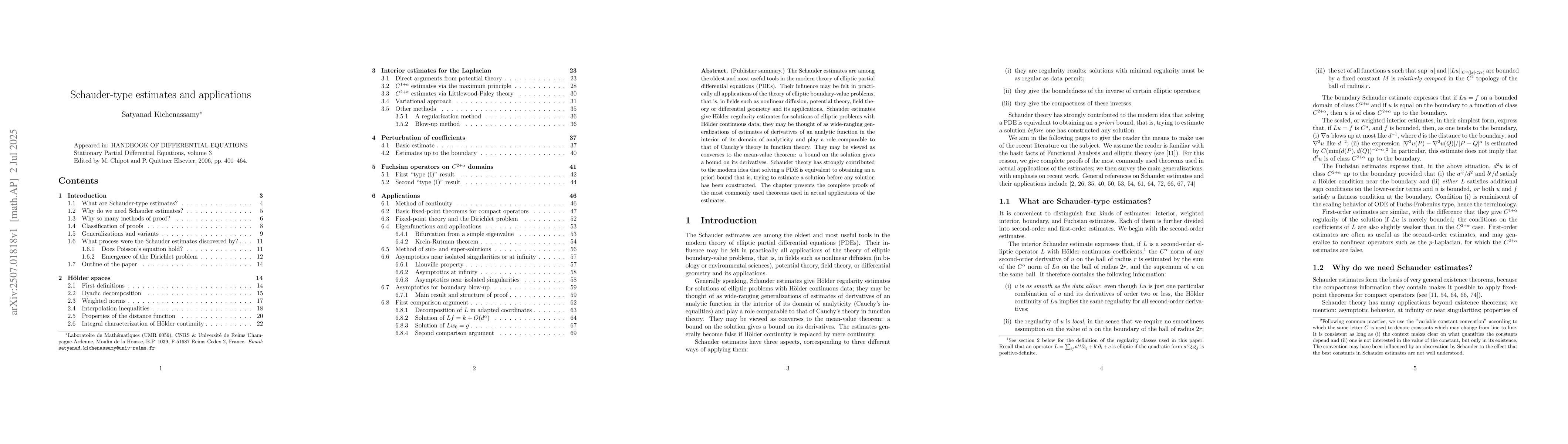 The Schauder estimates are among the oldest and most useful tools in the modern theory of elliptic partial differential equations (PDEs). Their influence may be felt in practically all applications of the theory of elliptic boundary-value problems, that is, in fields such as nonlinear diffusion, potential theory, field theory or differential geometry and its applications. Schauder estimates give H\"older regularity estimates for solutions of elliptic problems with H\"older continuous data; they may be thought of as wide-ranging generalizations of estimates of derivatives of an analytic function in the interior of its domain of analyticity and play a role comparable to that of Cauchy's theory in function theory. They may be viewed as converses to the mean-value theorem: a bound on the solution gives a bound on its derivatives. Schauder theory has strongly contributed to the modern idea that solving a PDE is equivalent to obtaining an a priori bound that is, trying to estimate a solution before any solution has been constructed. The chapter presents the complete proofs of the most commonly used theorems used in actual applications of the estimates.