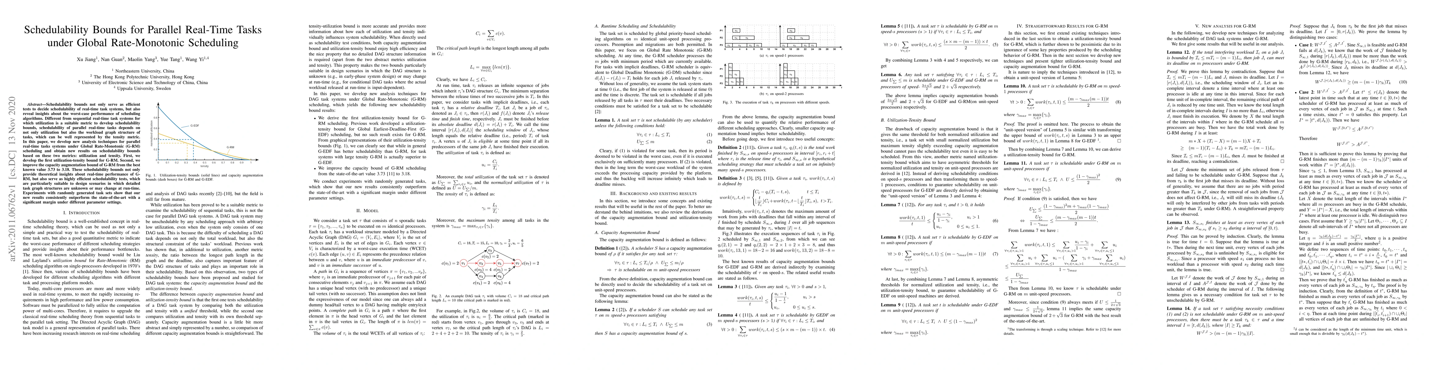 This paper develops new schedulability bounds for parallel real-time tasks under Global Rate-Monotonic Scheduling, introducing a utilization-tensity bound and improving the capacity augmentation bound from 3.73 to 3.18. These results provide both theoretical insights and efficient schedulability tests, outperforming existing methods in experiments.