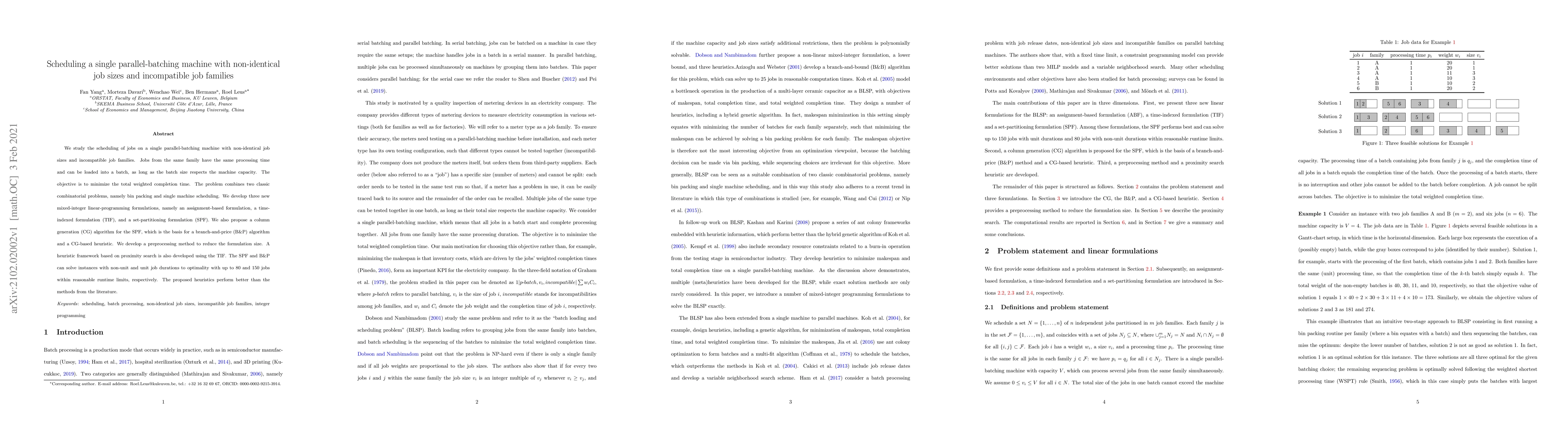 This paper addresses the scheduling of non-identical jobs on a parallel-batching machine with incompatible job families, aiming to minimize total weighted completion time. The authors develop three mixed-integer linear programming formulations and propose a branch-and-price algorithm and heuristics, achieving optimal solutions for up to 80 jobs and outperforming existing methods.