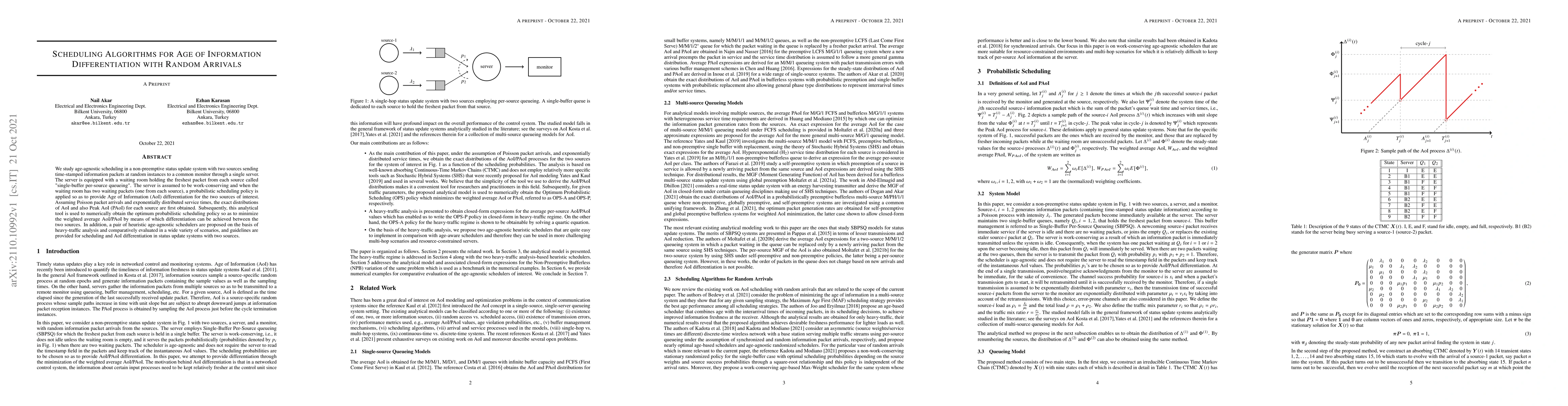 This paper investigates scheduling algorithms for age-agnostic status updates in a system with two sources, focusing on minimizing the Age of Information (AoI) through probabilistic scheduling. Analytical methods are used to derive the exact distributions of AoI and Peak AoI, and heuristic schedulers are proposed and evaluated for practical implementation.
