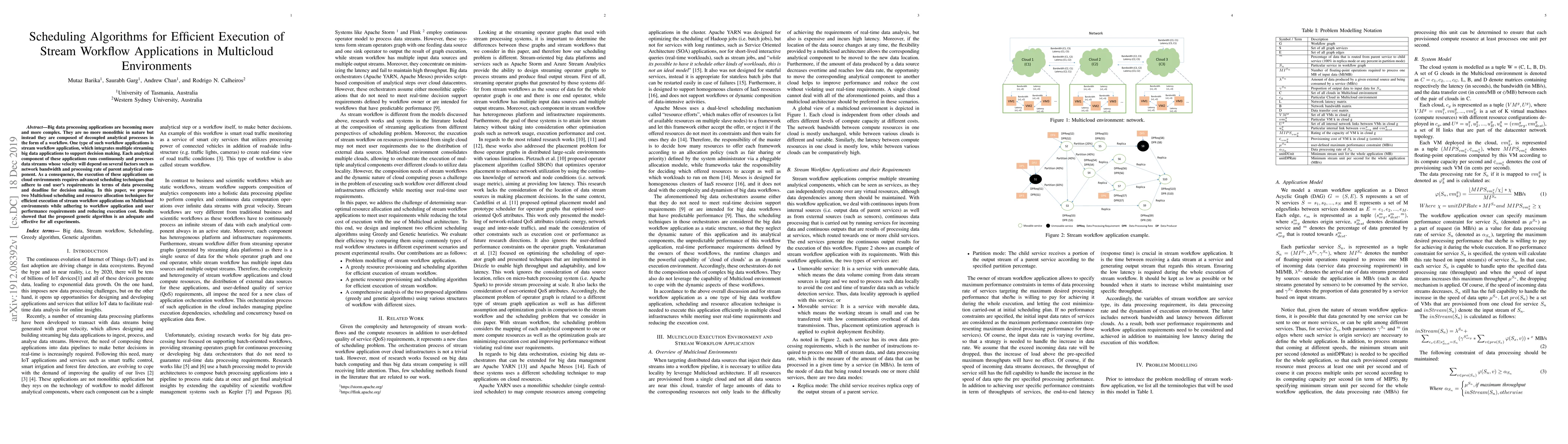 Big data processing applications are becoming more and more complex. They are no more monolithic in nature but instead they are composed of decoupled analytical processes in the form of a workflow. One type of such workflow applications is stream workflow application, which integrates multiple streaming big data applications to support decision making. Each analytical component of these applications runs continuously and processes data streams whose velocity will depend on several factors such as network bandwidth and processing rate of parent analytical component. As a consequence, the execution of these applications on cloud environments requires advanced scheduling techniques that adhere to end user's requirements in terms of data processing and deadline for decision making. In this paper, we propose two Multicloud scheduling and resource allocation techniques for efficient execution of stream workflow applications on Multicloud environments while adhering to workflow application and user performance requirements and reducing execution cost. Results showed that the proposed genetic algorithm is an adequate and effective for all experiments.