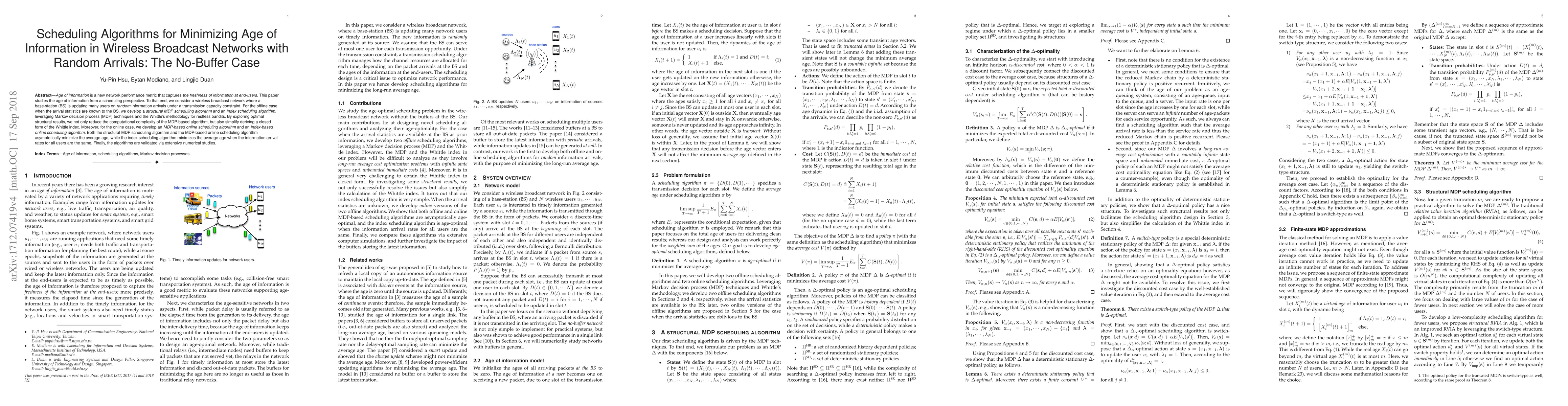 Age of information is a new network performance metric that captures the freshness of information at end-users. This paper studies the age of information from a scheduling perspective. To that end, we consider a wireless broadcast network where a base-station (BS) is updating many users on random information arrivals under a transmission capacity constraint. For the offline case when the arrival statistics are known to the BS, we develop a structural MDP scheduling algorithm and an index scheduling algorithm, leveraging Markov decision process (MDP) techniques and the Whittle's methodology for restless bandits. By exploring optimal structural results, we not only reduce the computational complexity of the MDP-based algorithm, but also simplify deriving a closed form of the Whittle index. Moreover, for the online case, we develop an MDP-based online scheduling algorithm and an index-based online scheduling algorithm. Both the structural MDP scheduling algorithm and the MDP-based online scheduling algorithm asymptotically minimize the average age, while the index scheduling algorithm minimizes the average age when the information arrival rates for all users are the same. Finally, the algorithms are validated via extensive numerical studies.