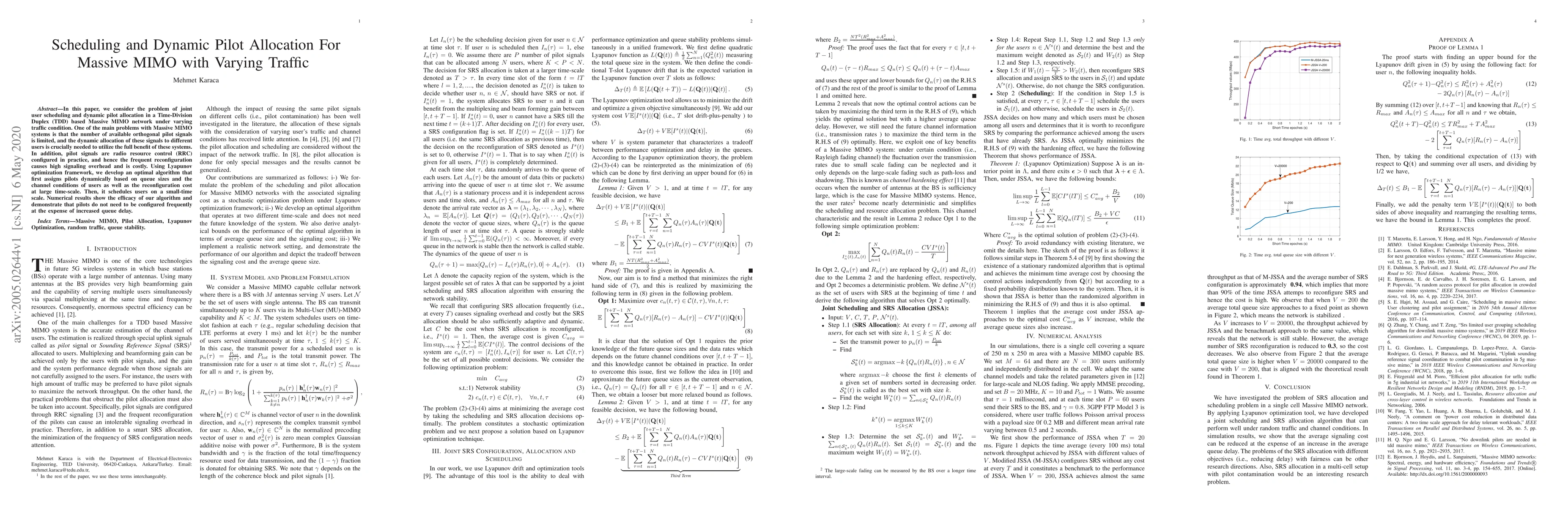 This paper proposes an optimal algorithm for joint user scheduling and dynamic pilot allocation in a TDD-based Massive MIMO network under varying traffic conditions. Using Lyapunov optimization, the algorithm dynamically assigns pilots based on user queue sizes and channel conditions, minimizing reconfiguration costs and signaling overhead while maintaining performance.
