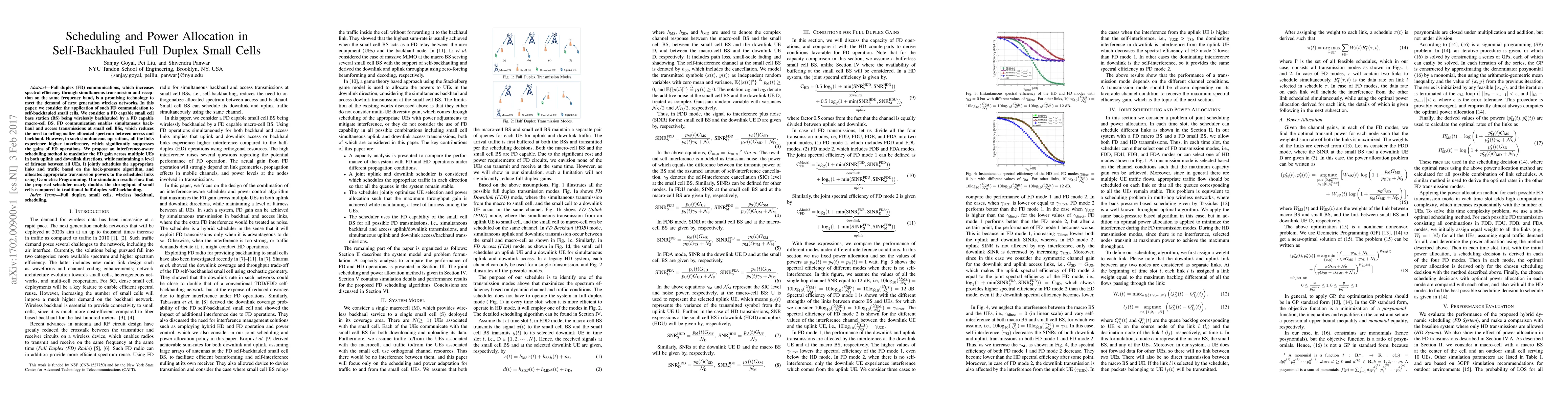 This paper proposes an interference-aware scheduling and power allocation method for self-backhauled full duplex small cells to maximize throughput while maintaining fairness among users. The method jointly schedules links and traffic using back-pressure and allocates power via Geometric Programming, nearly doubling throughput compared to half-duplex systems.