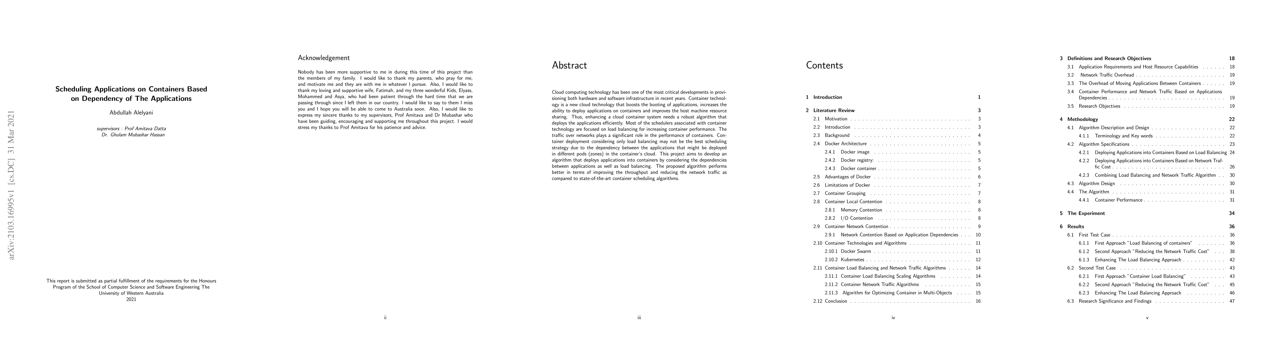 Cloud computing technology has been one of the most critical developments in provisioning both hardware and software infrastructure in recent years. Container technology is a new cloud technology that boosts the booting of applications, increases the ability to deploy applications on containers and improves the host machine resource sharing. Thus, enhancing a cloud container system needs a robust algorithm that deploys the applications efficiently. Most of the schedulers associated with container technology are focused on load balancing for increasing container performance. The traffic over networks plays a significant role in the performance of containers. Container deployment considering only load balancing may not be the best scheduling strategy due to the dependency between the applications that might be deployed in different pods (zones) in the container's cloud. This project aims to develop an algorithm that deploys applications into containers by considering the dependencies between applications as well as load balancing. The proposed algorithm performs better in terms of improving the throughput and reducing the network traffic as compared to state-of-the-art container scheduling algorithms.