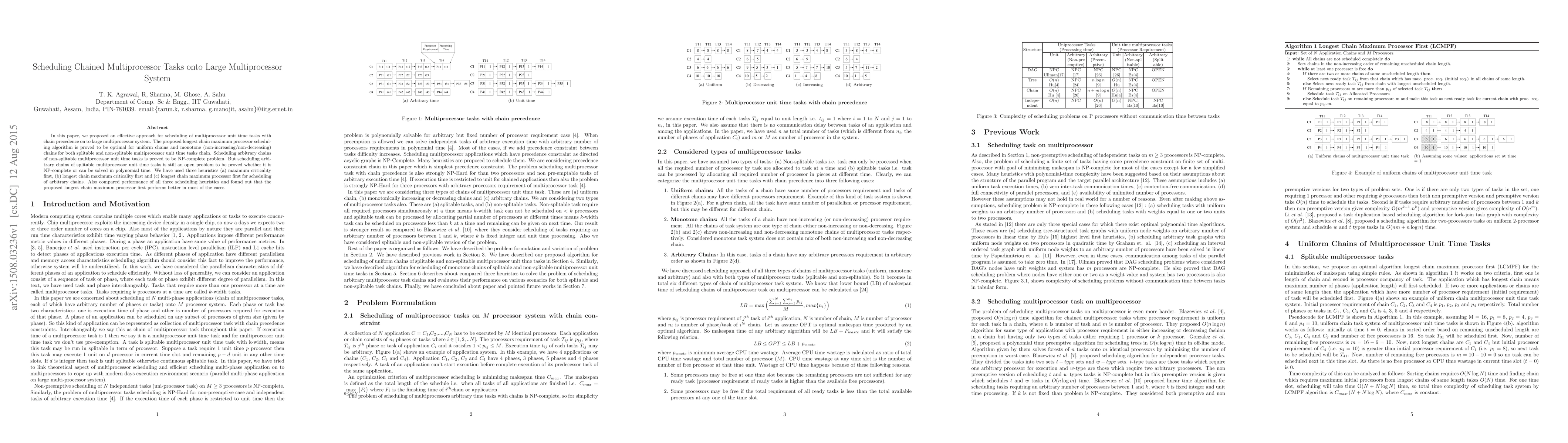 This paper proposes an optimal scheduling algorithm for multiprocessor unit time tasks with chain precedence on large multiprocessor systems. The longest chain maximum processor scheduling algorithm is shown to be optimal for uniform and monotone chains, while scheduling arbitrary chains of non-splitable tasks is NP-complete. Three heuristics are evaluated, and the longest chain maximum processor first heuristic is found to perform best in most scenarios.