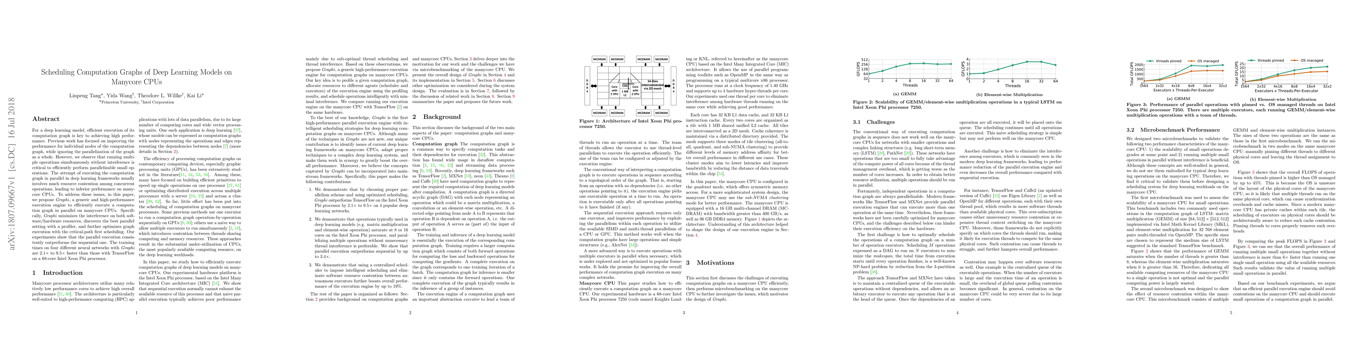 This paper proposes Graphi, an execution engine designed to efficiently parallelize and execute deep learning computation graphs on manycore CPUs by minimizing resource contention and optimizing scheduling. Experiments demonstrate significant speedups, with training times for four neural networks being 2.1x to 9.5x faster than TensorFlow on a 68-core processor.