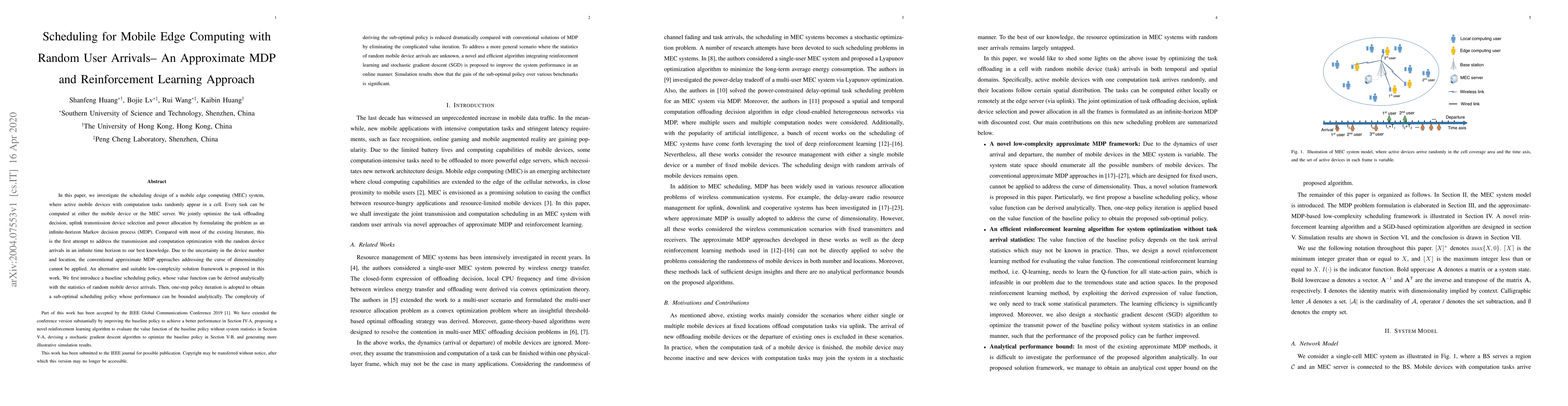 In this paper, we investigate the scheduling design of a mobile edge computing (MEC) system, where active mobile devices with computation tasks randomly appear in a cell. Every task can be computed at either the mobile device or the MEC server. We jointly optimize the task offloading decision, uplink transmission device selection and power allocation by formulating the problem as an infinite-horizon Markov decision process (MDP). Compared with most of the existing literature, this is the first attempt to address the transmission and computation optimization with the random device arrivals in an infinite time horizon to our best knowledge. Due to the uncertainty in the device number and location, the conventional approximate MDP approaches addressing the curse of dimensionality cannot be applied. An alternative and suitable low-complexity solution framework is proposed in this work. We first introduce a baseline scheduling policy, whose value function can be derived analytically with the statistics of random mobile device arrivals. Then, one-step policy iteration is adopted to obtain a sub-optimal scheduling policy whose performance can be bounded analytically. The complexity of deriving the sub-optimal policy is reduced dramatically compared with conventional solutions of MDP by eliminating the complicated value iteration. To address a more general scenario where the statistics of random mobile device arrivals are unknown, a novel and efficient algorithm integrating reinforcement learning and stochastic gradient descent (SGD) is proposed to improve the system performance in an online manner. Simulation results show that the gain of the sub-optimal policy over various benchmarks is significant.