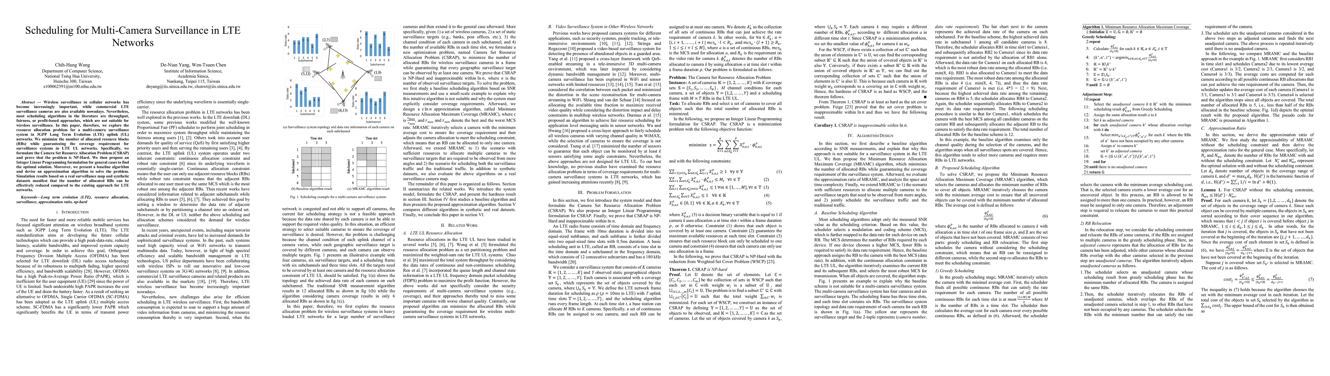 Wireless surveillance in cellular networks has become increasingly important, while commercial LTE surveillance cameras are also available nowadays. Nevertheless, most scheduling algorithms in the literature are throughput, fairness, or profit-based approaches, which are not suitable for wireless surveillance. In this paper, therefore, we explore the resource allocation problem for a multi-camera surveillance system in 3GPP Long Term Evolution (LTE) uplink (UL) networks. We minimize the number of allocated resource blocks (RBs) while guaranteeing the coverage requirement for surveillance systems in LTE UL networks. Specifically, we formulate the Camera Set Resource Allocation Problem (CSRAP) and prove that the problem is NP-Hard. We then propose an Integer Linear Programming formulation for general cases to find the optimal solution. Moreover, we present a baseline algorithm and devise an approximation algorithm to solve the problem. Simulation results based on a real surveillance map and synthetic datasets manifest that the number of allocated RBs can be effectively reduced compared to the existing approach for LTE networks.