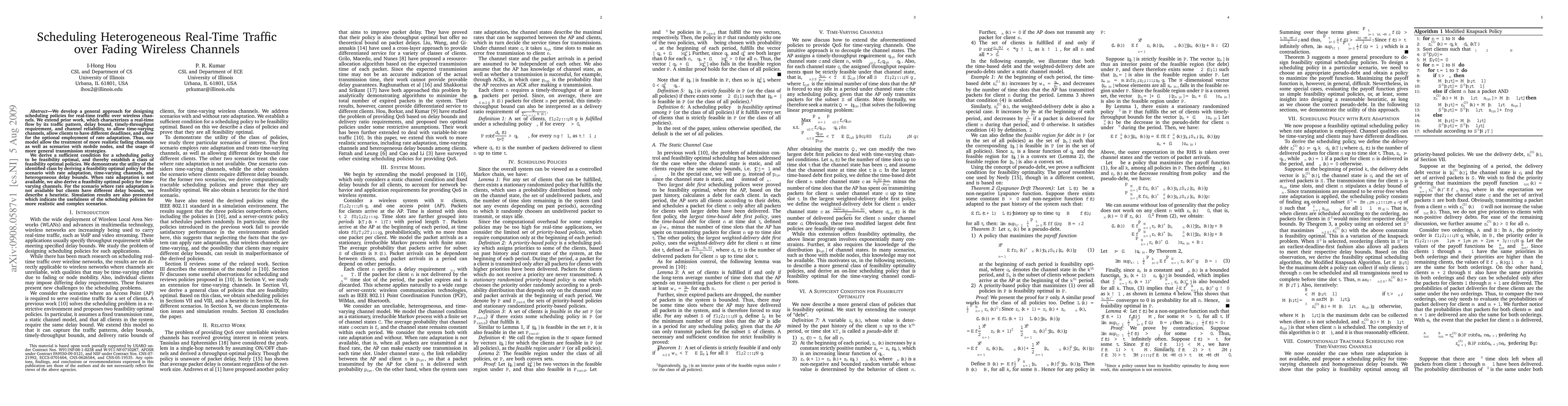 This paper proposes a scheduling policy for real-time traffic over fading wireless channels, accommodating time-varying channels, diverse client deadlines, and optional rate adaptation. It establishes a class of feasibility optimal policies and demonstrates their utility through specific scenarios, supported by simulation results.