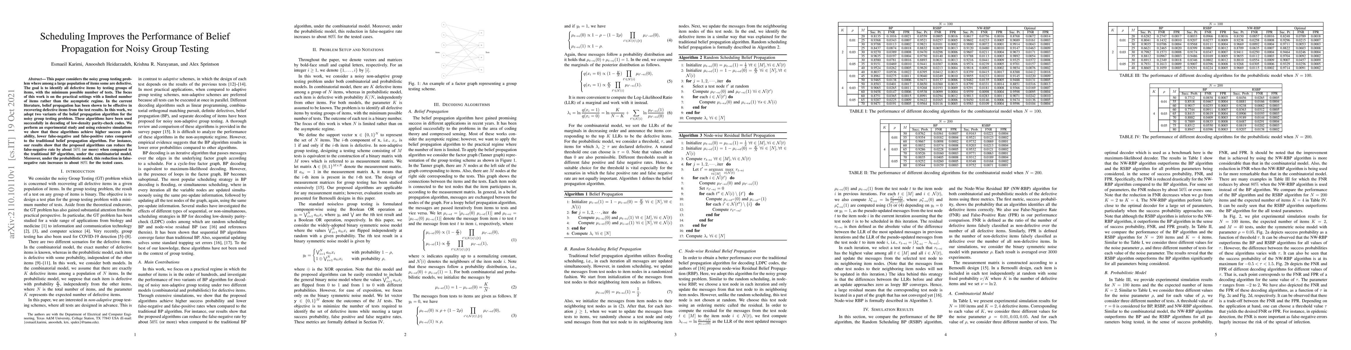 This paper considers the noisy group testing problem where among a large population of items some are defective. The goal is to identify all defective items by testing groups of items, with the minimum possible number of tests. The focus of this work is on the practical settings with a limited number of items rather than the asymptotic regime. In the current literature, belief propagation has been shown to be effective in recovering defective items from the test results. In this work, we adopt two variants of the belief propagation algorithm for the noisy group testing problem. These algorithms have been used successfully in the decoding of low-density parity-check codes. We perform an experimental study and using extensive simulations we show that these algorithms achieve higher success probability, lower false-negative, and false-positive rates compared to the traditional belief propagation algorithm. For instance, our results show that the proposed algorithms can reduce the false-negative rate by about $50\%$ (or more) when compared to the traditional BP algorithm, under the combinatorial model. Moreover, under the probabilistic model, this reduction in the false-negative rate increases to about $80\%$ for the tested cases.