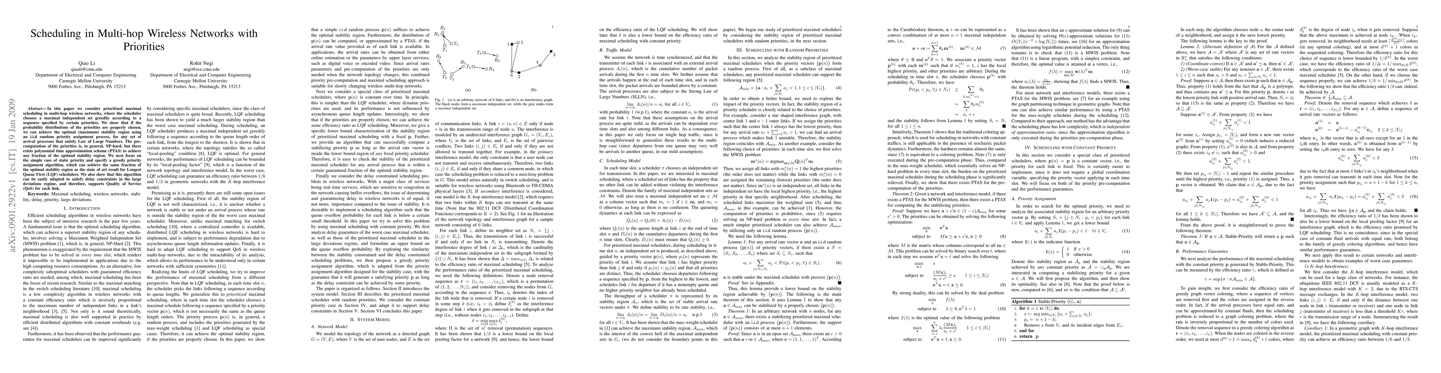 This paper explores prioritized maximal scheduling in multi-hop wireless networks, demonstrating optimal stability region achievement through properly chosen priority distributions. It introduces a polynomial-time approximation scheme for pre-computation and a greedy algorithm for static priorities that matches state-of-the-art results while supporting QoS and delay constraints.