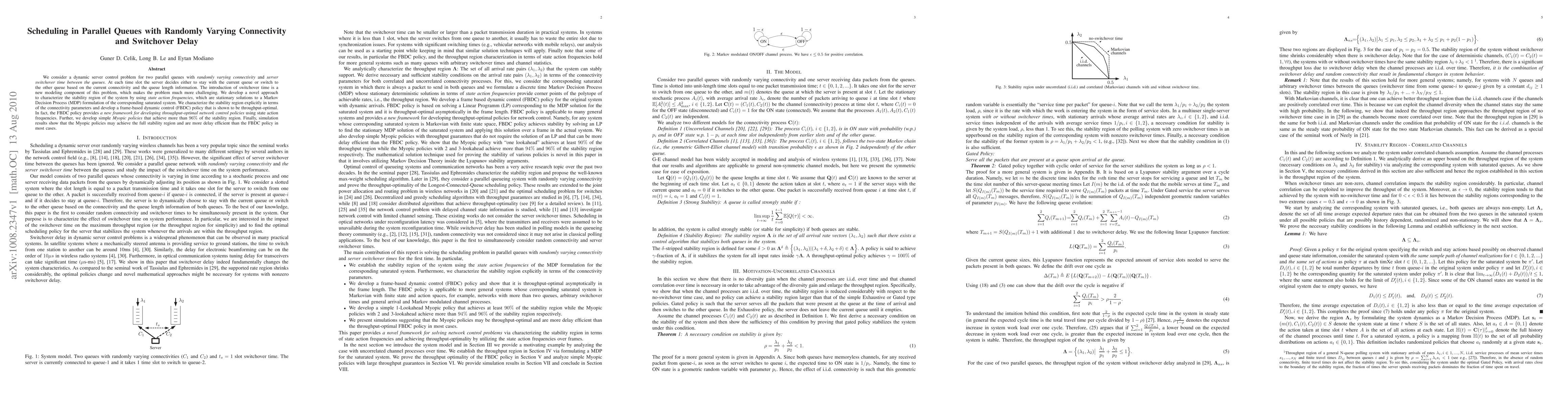 Researchers developed a new approach to control parallel queues with varying connectivity, finding that a frame-based policy is throughput-optimal but can be improved upon by simpler Myopic policies, which may achieve the full stability region in simulations.