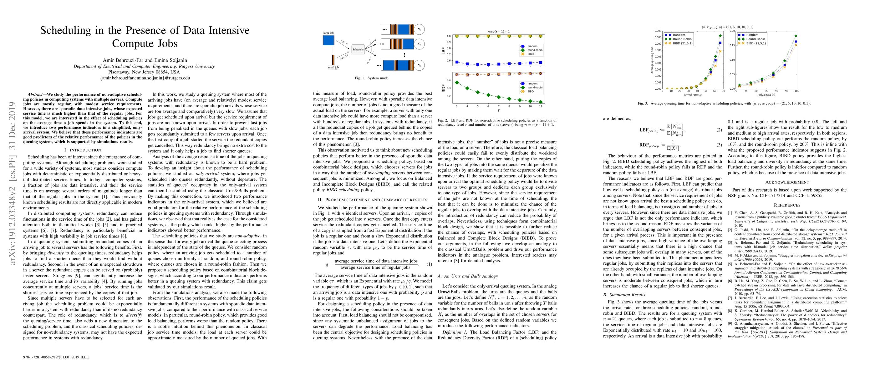 We study the performance of non-adaptive scheduling policies in computing systems with multiple servers. Compute jobs are mostly regular, with modest service requirements. However, there are sporadic data intensive jobs, whose expected service time is much higher than that of the regular jobs. Forthis model, we are interested in the effect of scheduling policieson the average time a job spends in the system. To this end, we introduce two performance indicators in a simplified, only-arrival system. We believe that these performance indicators are good predictors of the relative performance of the policies in the queuing system, which is supported by simulations results.