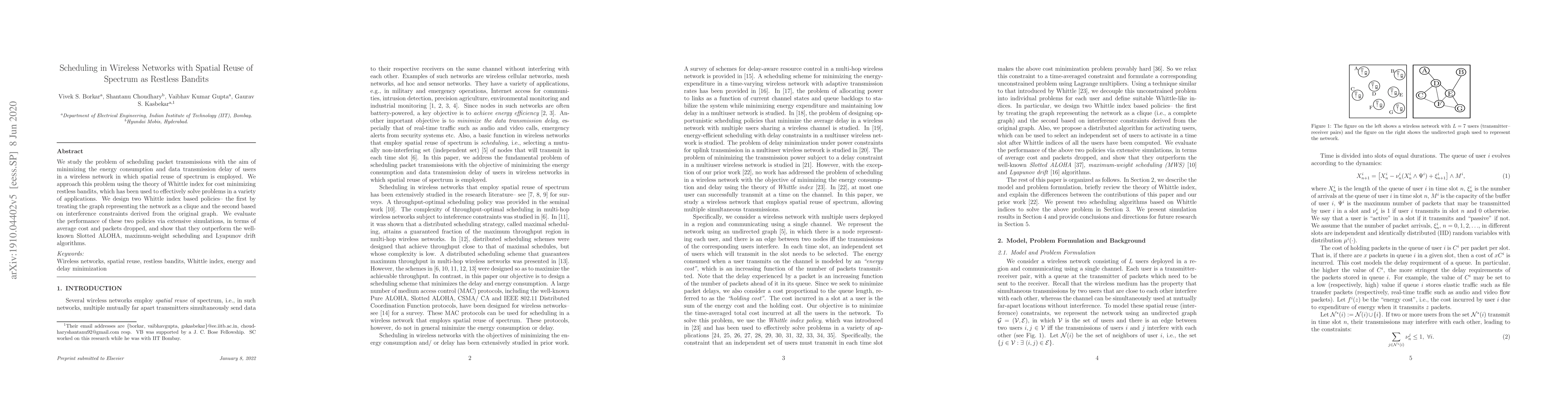 This paper addresses the scheduling of packet transmissions in wireless networks using spatial reuse of spectrum, aiming to minimize energy consumption and delay. It employs Whittle index policies for restless bandits, evaluating two approaches: one treating the network graph as a clique and the other considering interference constraints, which outperform Slotted ALOHA and maximum weight scheduling in simulations.